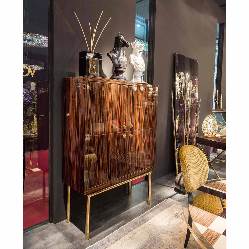 Wnętrze jest nieprzejrzyste lakierowane z lustrzanym oparciem i półką konstrukcyjną (plus dwie szklane półki w zestawie), z zamknięciem zamykającym Salice z wykończeniem polerowanym i wykończonymi złotem odlewanymi gałkami lub uchwytami. Metalowa podstawa z 24-karatowym złotym wykończeniem.