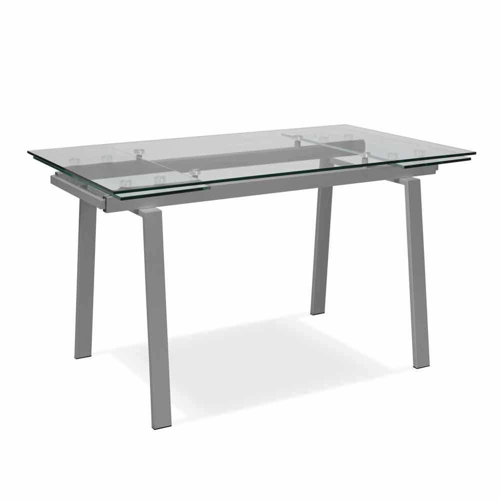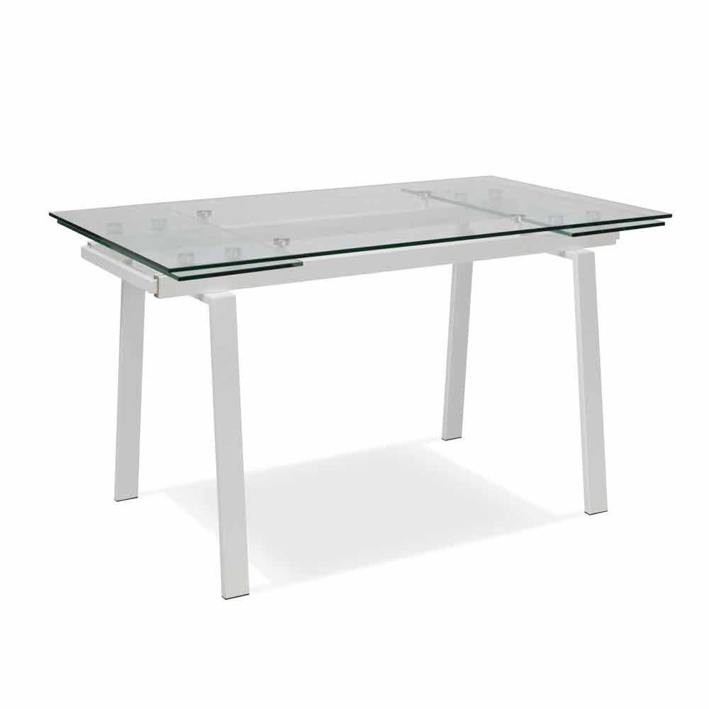 Rozkładany stół designerski z malowaną metalową podstawą. Blat i przedłużenia z przezroczystego szkła hartowanego.