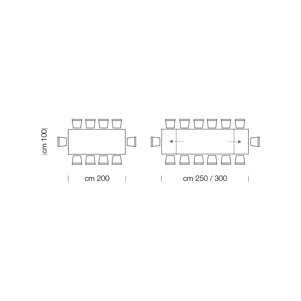 - Dł. 200 (300) x gł. 100 x wys. 76,5 cm 14 miejsc z możliwością przedłużenia za pomocą dwóch zewnętrznych przedłużek o długości 50 cm.