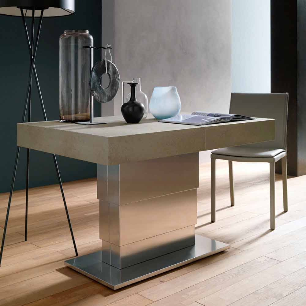 Prostokątny blat można przedłużyć za pomocą czterech nadstawek (2 wewnętrzne i 2 zewnętrzne) po 50 cm każda. Można go przekształcić w stół jadalny dzięki mechanizmowi gazowemu, który reguluje wysokość co do milimetra: od 41 cm do 76 cm.