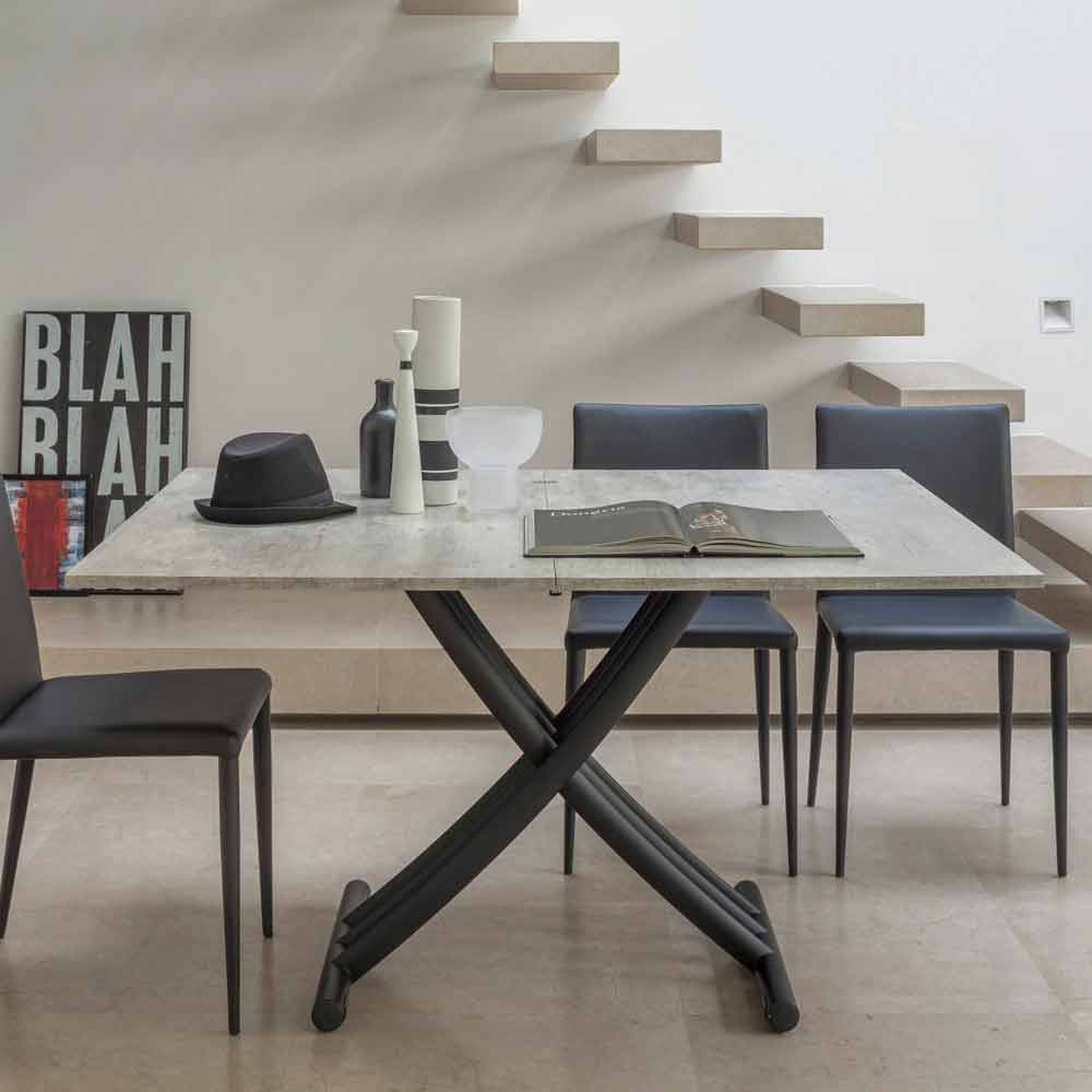 Przekształcalny stolik kawowy z metalowym i drewnianym blatem wyprodukowany we Włoszech.
