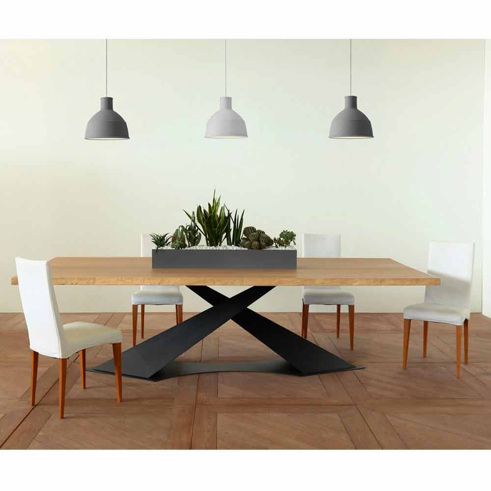 Stół Elliot charakteryzuje się szczotkowanym, litym dębowym blatem z krawędzią kory, pomalowanym naturalnym efektem i farbą na bazie wody odpornej na zadrapania, z wyjątkową cechą zapewniającą niezwykły efekt stołu bez ryzyka odkształceń i pęknięć związanych z litym drewnem i podporą metal centralny, z elementami pochylonymi i skrzyżowanymi asymetrycznie.