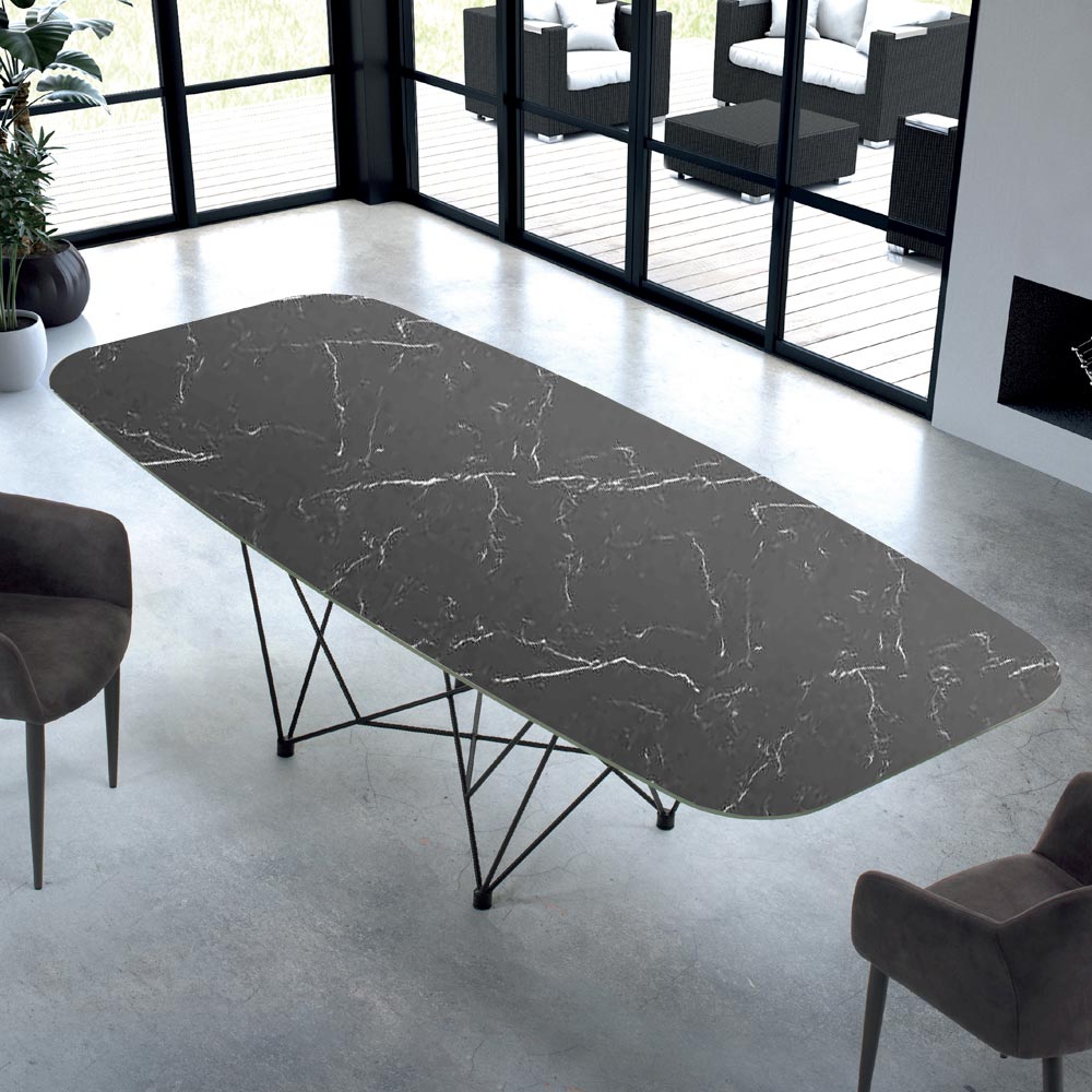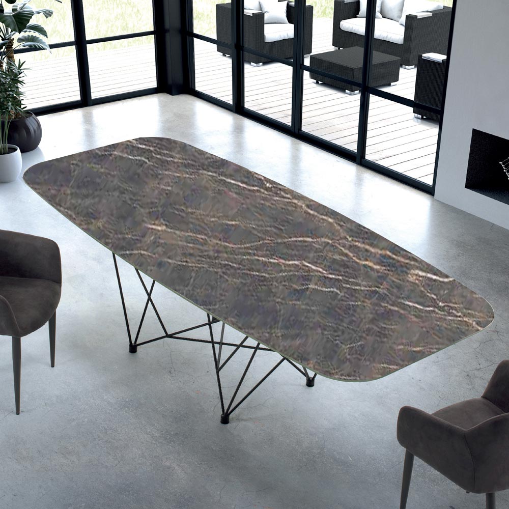 ceramicznym blatem uzyskanym z fazowanej tafli szkła i blachy ceramicznej z efektem marmuru oraz