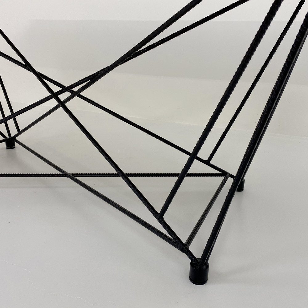 Stół w kształcie beczki z ceramicznym blatem i czarną stalową podstawą wyprodukowany we Włoszech.