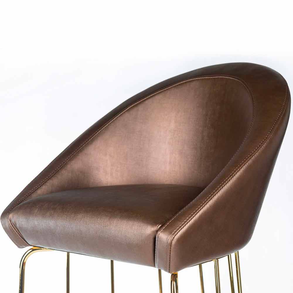 Stołek barowy z tapicerowanym siedziskiem i oparciem, charakteryzujący się wyrafinowanym i nowoczesnym wyglądem.