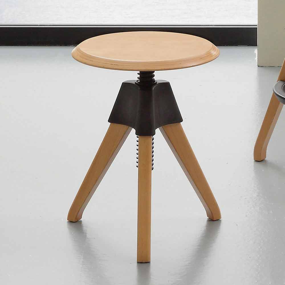 Nowoczesny taboret wykonany z litego drewna bukowego z czarnymi detalami z polipropylenu.
