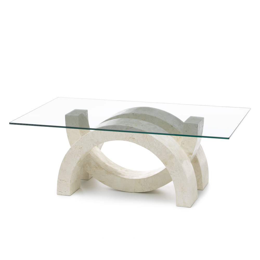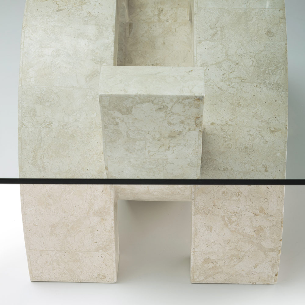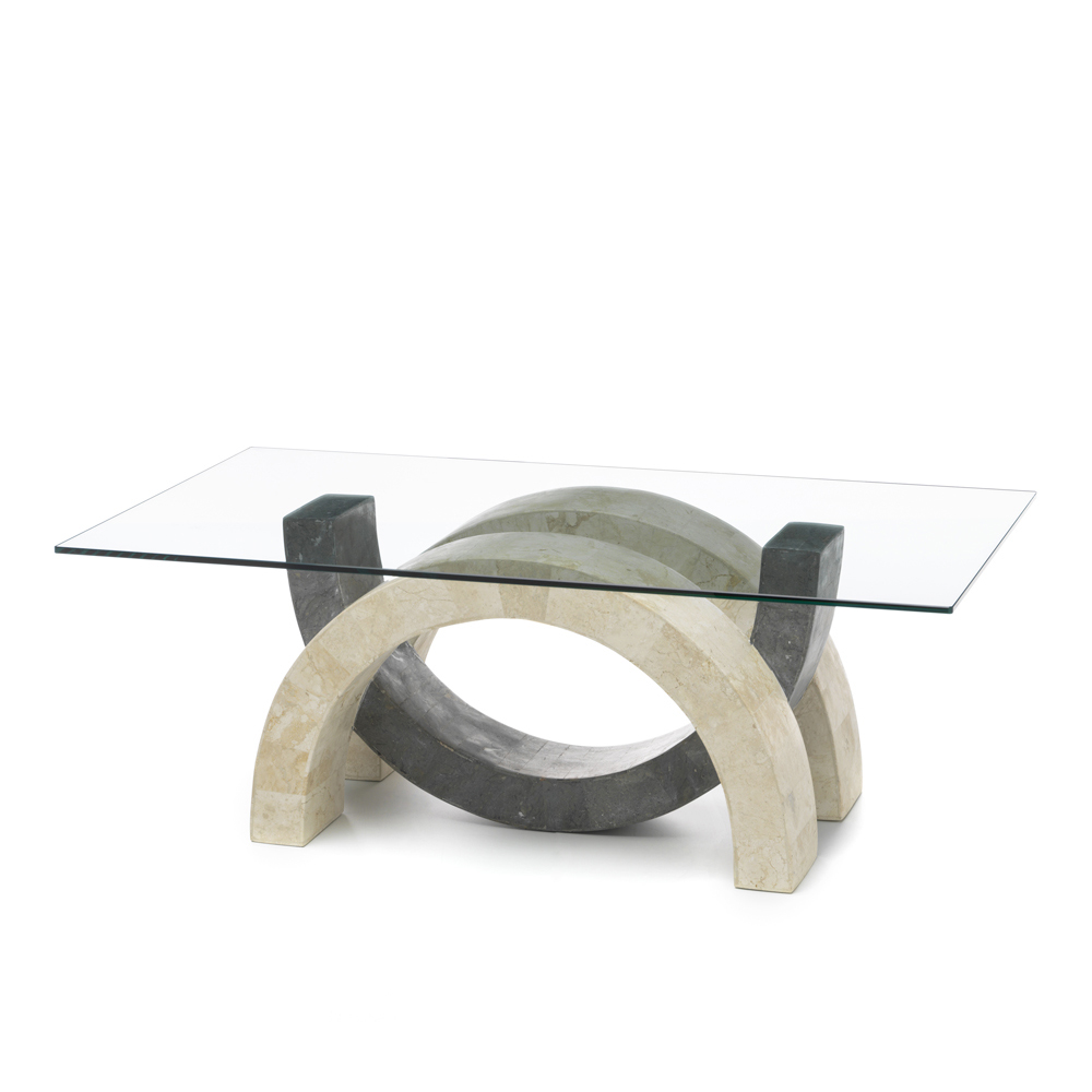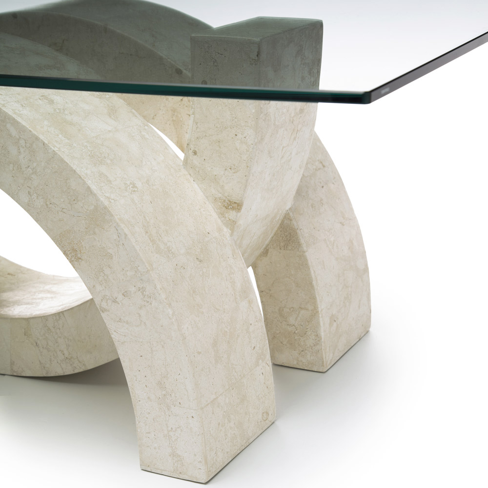 W stoliku kawowym Austin klasycyzm i nowoczesność łączą się, tworząc niezwykle ciekawy kontrast stylistyczny. Lekkość szkła pozwala prześwitywać skamieniałej strukturze kamienia , która go podtrzymuje: solidne, ale dynamiczne splot zaokrąglonych linii.