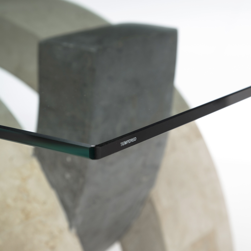 Nowoczesny stolik kawowy z kamienia i blatu ze szkła o grubości 10 mm, polerowana krawędź.