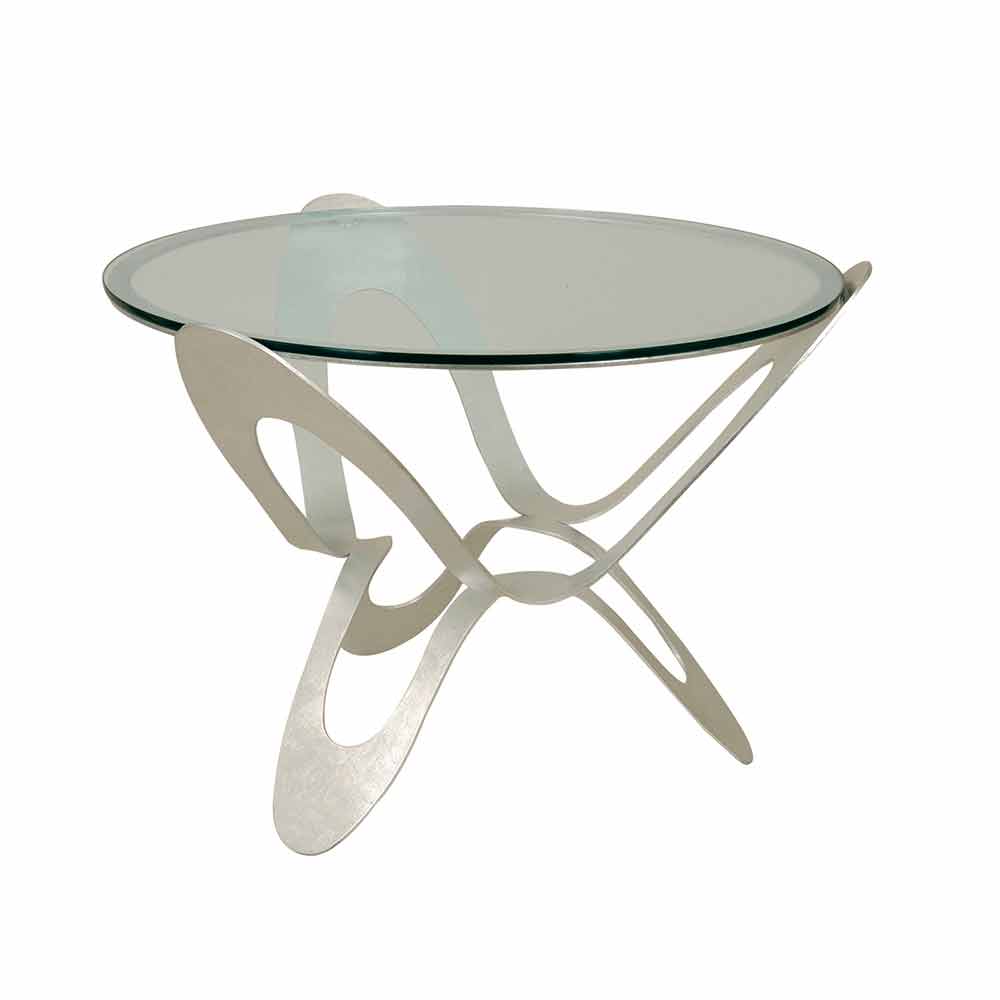 Niski okrągły stolik kawowy wyprodukowany we Włoszech ręcznie wykonany ze szkła i żelaza ze złota lub srebra.