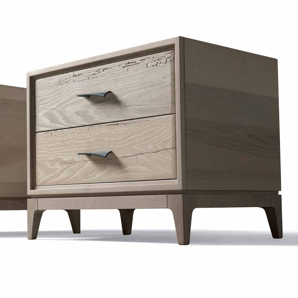 Do spania, szafka nocna o rygorystycznym kształcie, z eleganckimi uchwytami o lekko nachylonym kształcie na dębowych drzwiach.