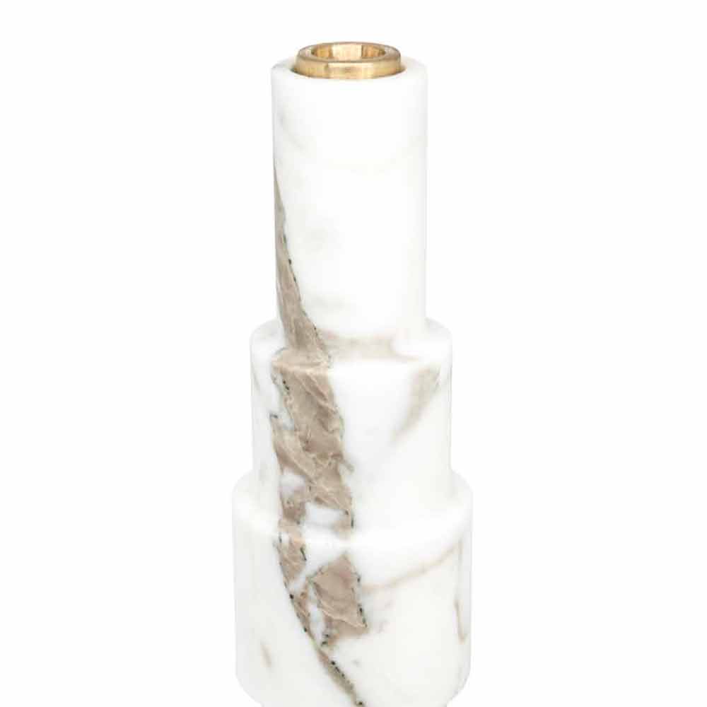 Świecznik wykonany z białego marmuru karraryjskiego i mosiądzu na swój niepowtarzalny sposób, ponieważ każdy blok marmuru ma inne żyły i odcienie. Marmur użyty do wykonania produktu pochodzi z kamieniołomu Poggio Silvestre, który jest źródłem najwyższej jakości białego marmuru klasyfikowanego od ubiegłego wieku.