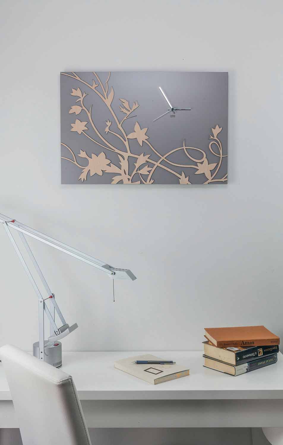 Duży zegar ścienny o prostokątnym i nowoczesnym designie z szarego i zdobionego drewna, wyprodukowany we Włoszech.