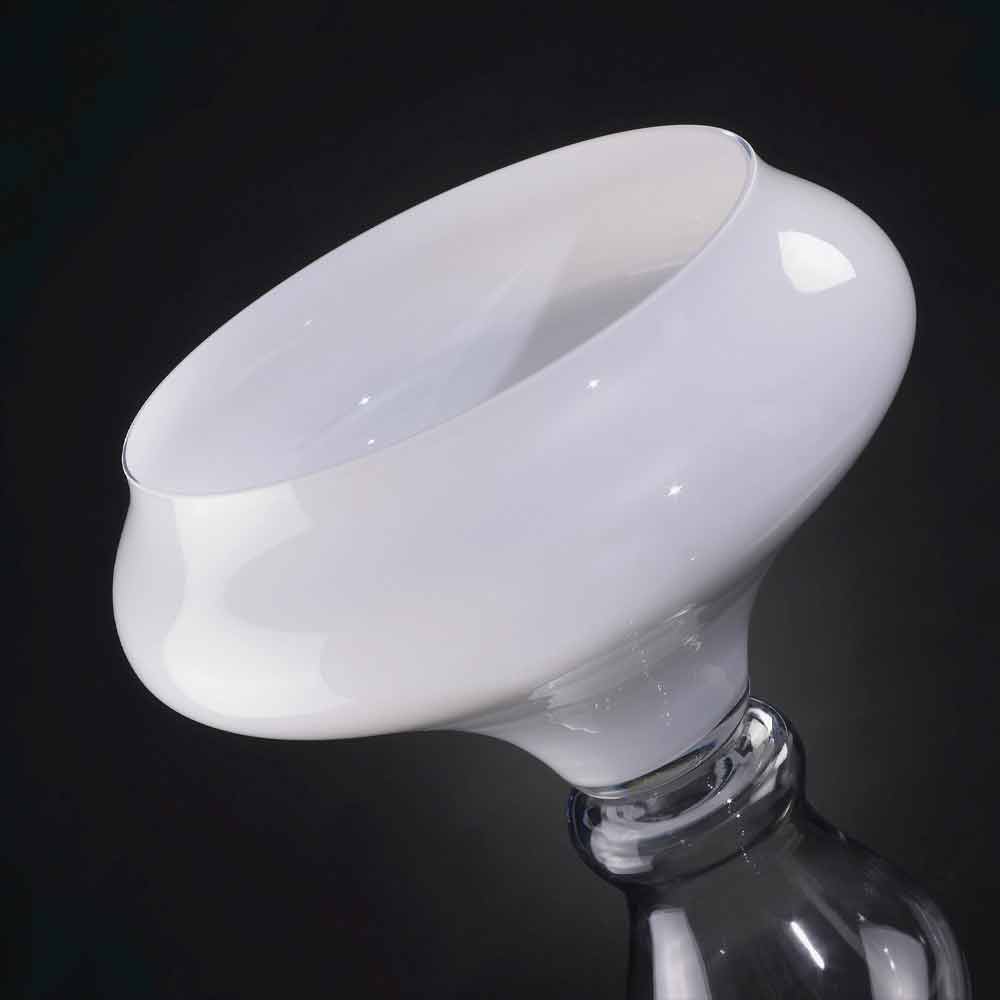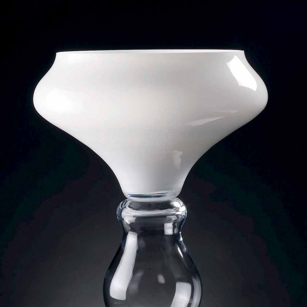 Wewnętrzny wazon ozdobny z białego szkła z przezroczystą podstawą wykonaną w 100% w procesie Made in Italy . Nowoczesne uzupełnienie, którego estetyka wyraża wyrafinowanie, proponując smukłą sylwetkę o miękkich i krętych kształtach, idealną do wyposażenia i uzupełnienia otoczenia ekskluzywnym stylem, również dzięki ponadczasowej elegancji szkła, wysokiej jakości materiału o wysokiej wartości . Idealny projekt dla najróżniejszych środowisk, od wyposażenia domu po hotele, restauracje, powierzchnie kontraktowe, spa, ale także jako oprawa imprez i wesel.