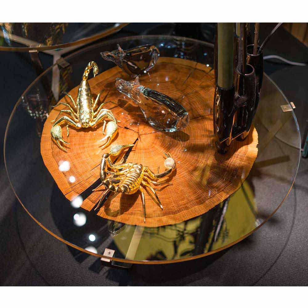 Wierzch składa się z dwóch warstw szkła sprzężonego z 5 + 5 cm, zawierającego sekcję ciętego drewna, wspartą na wypolerowanych polerowanych nogach z mosiądzu.