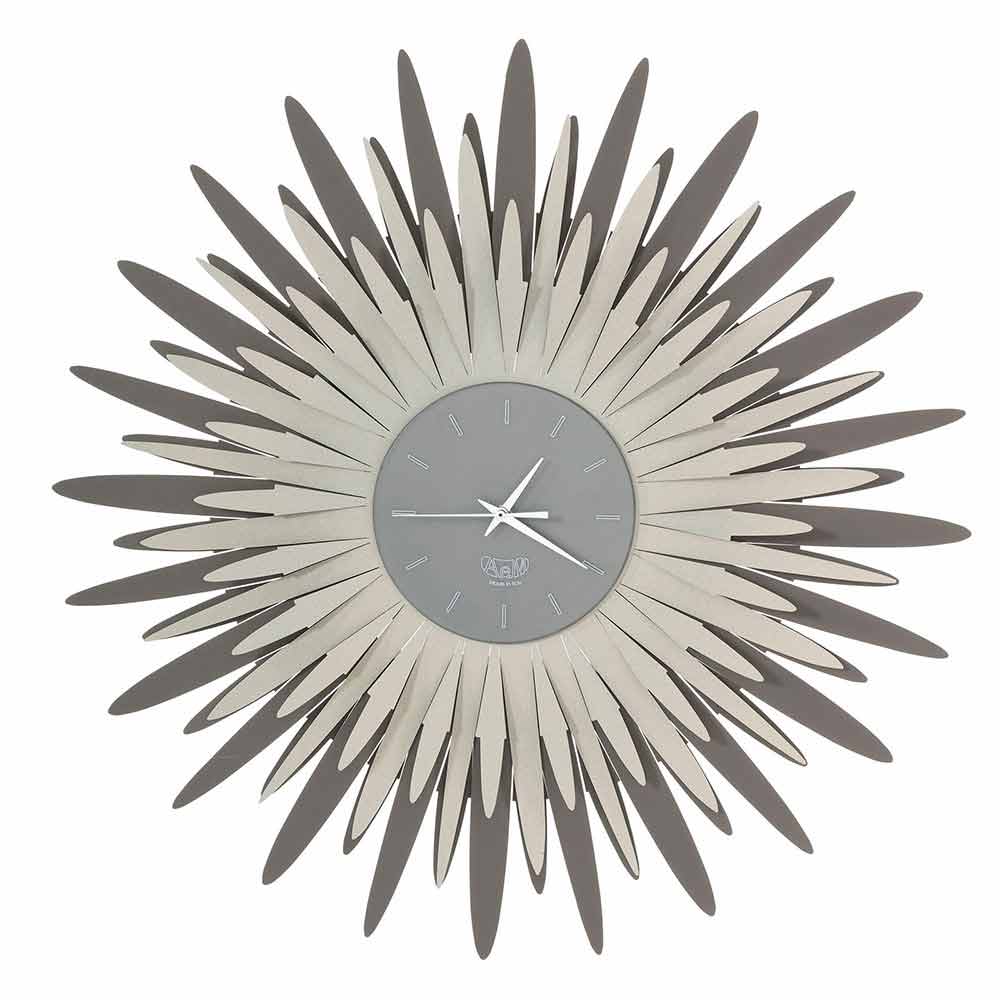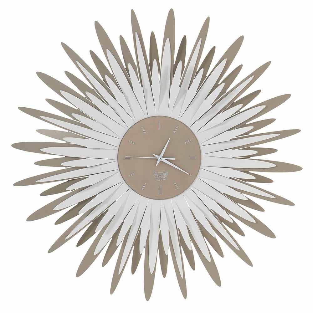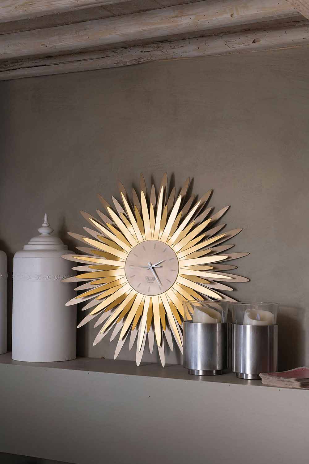 zegar ścienny charakteryzujący się licznymi i jasnymi promieniami słonecznymi wokół tarczy.