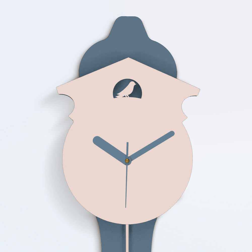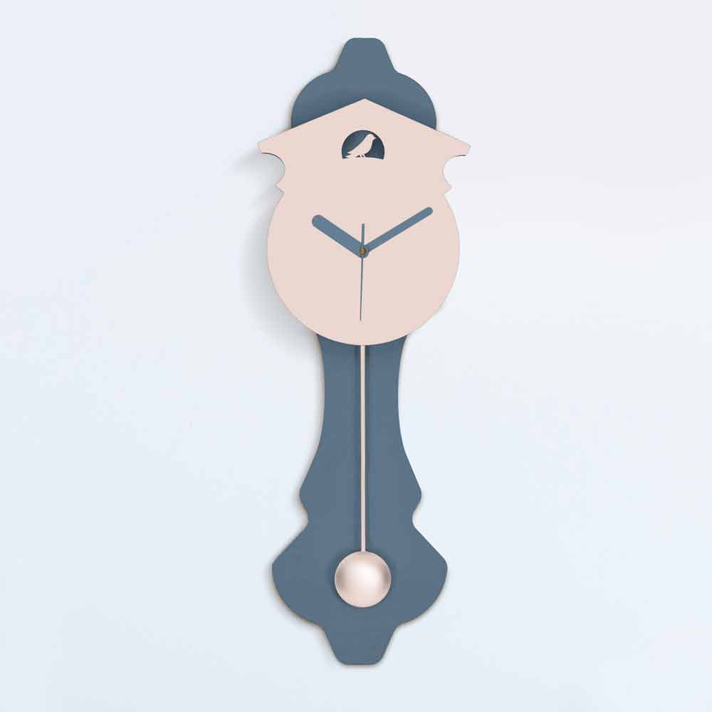 Zegar ścienny wahadłowy, szaro-różowy, nowoczesny design z laserowo wycinanego drewna, wyprodukowany we Włoszech.