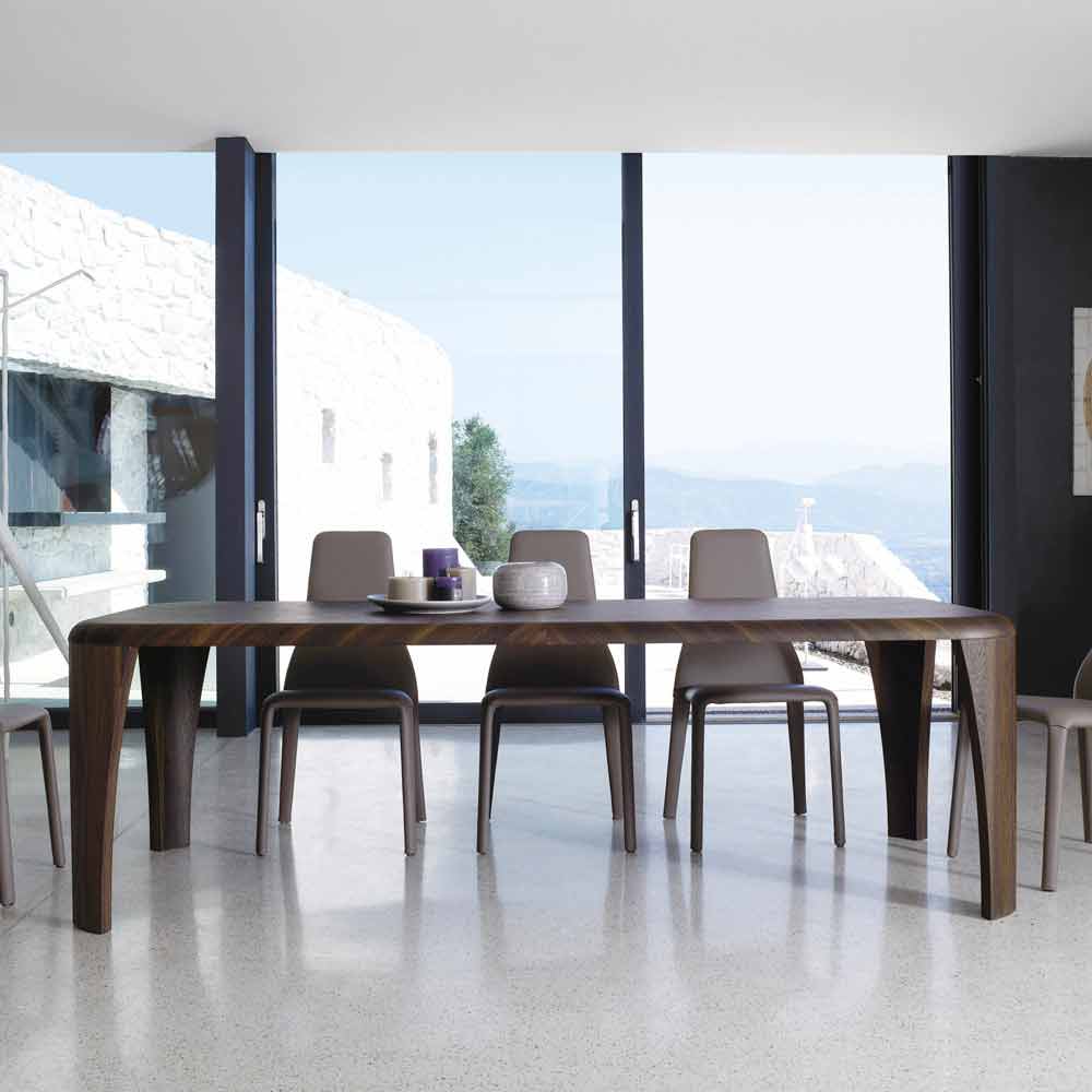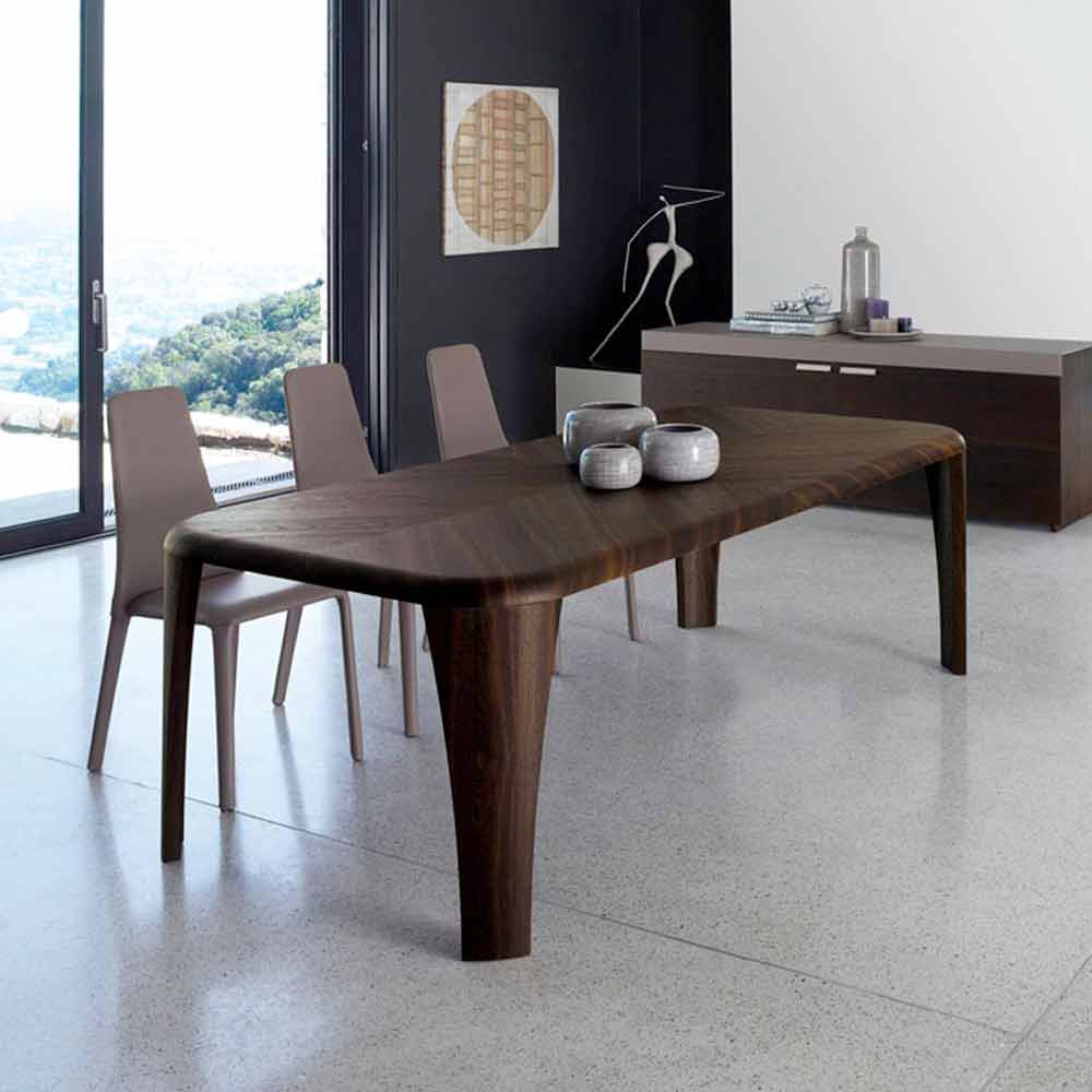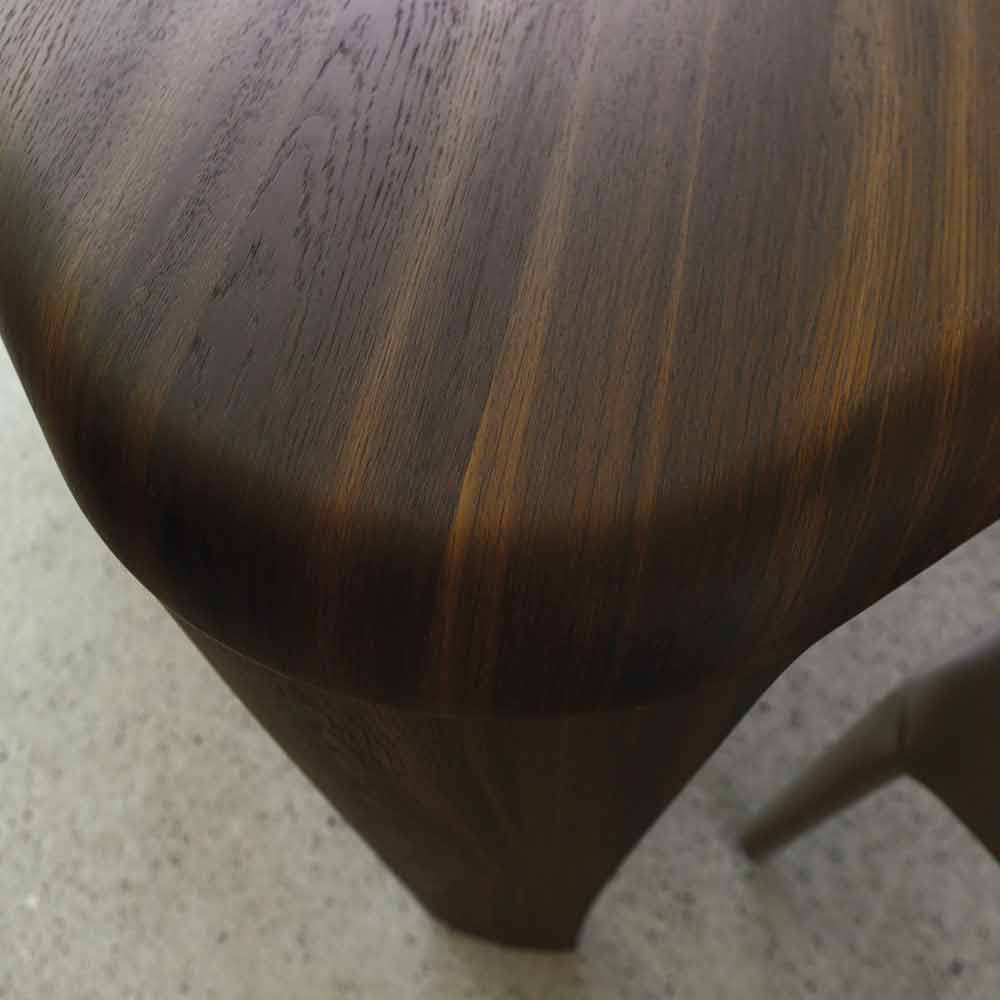 Stół wykonany z drewna, według wolnego wzoru, w którym linie są delikatnie zakrzywione i wolne od krawędzi.