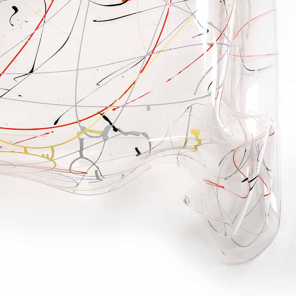 Płyta z czystego 100% pierwotnego polimeru z pleksi PMMA z farbą natryskową; Jest ręcznie drapowany w wysokich temperaturach, aby stworzyć niepowtarzalny i niepowtarzalny stół. Zbudowana konstrukcja jest całkowicie samonośna.