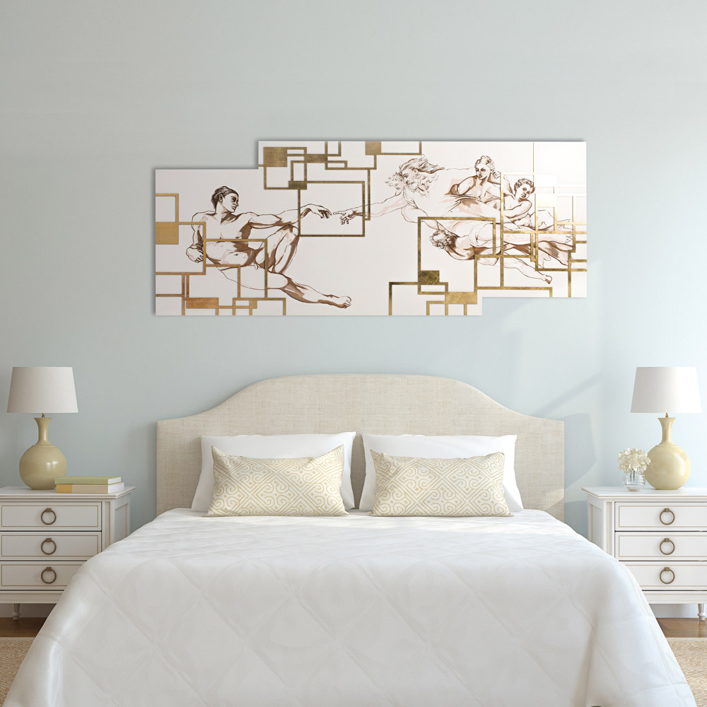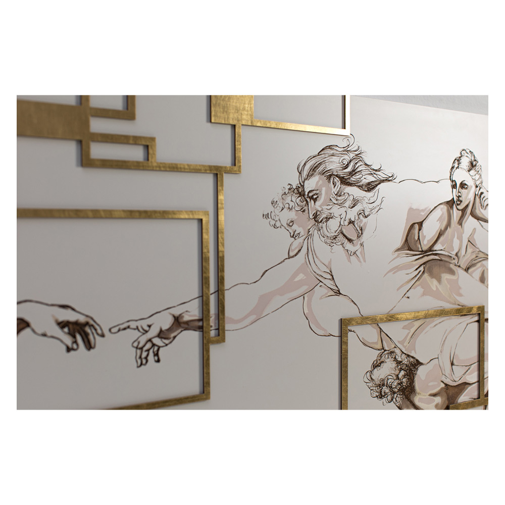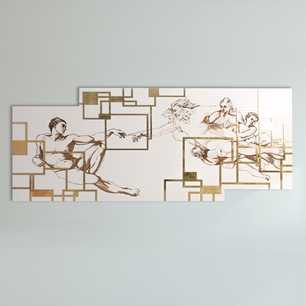 Panel jest unikalnym wezgłowiem przedstawiającym centralną część fresku Michała Anioła w Kaplicy Sykstyńskiej „Stworzenie Adama” . Fresk jest umiejętnie odwzorowany w najdrobniejszych szczegółach dzięki znakowaniu laserowemu, które tworzy niuanse koloru i głębi . Rama z matowego białego lakierowanego drewna ze znakowaniem laserowym, specjalną techniką, która tworzy płaskorzeźbę na materiałach.