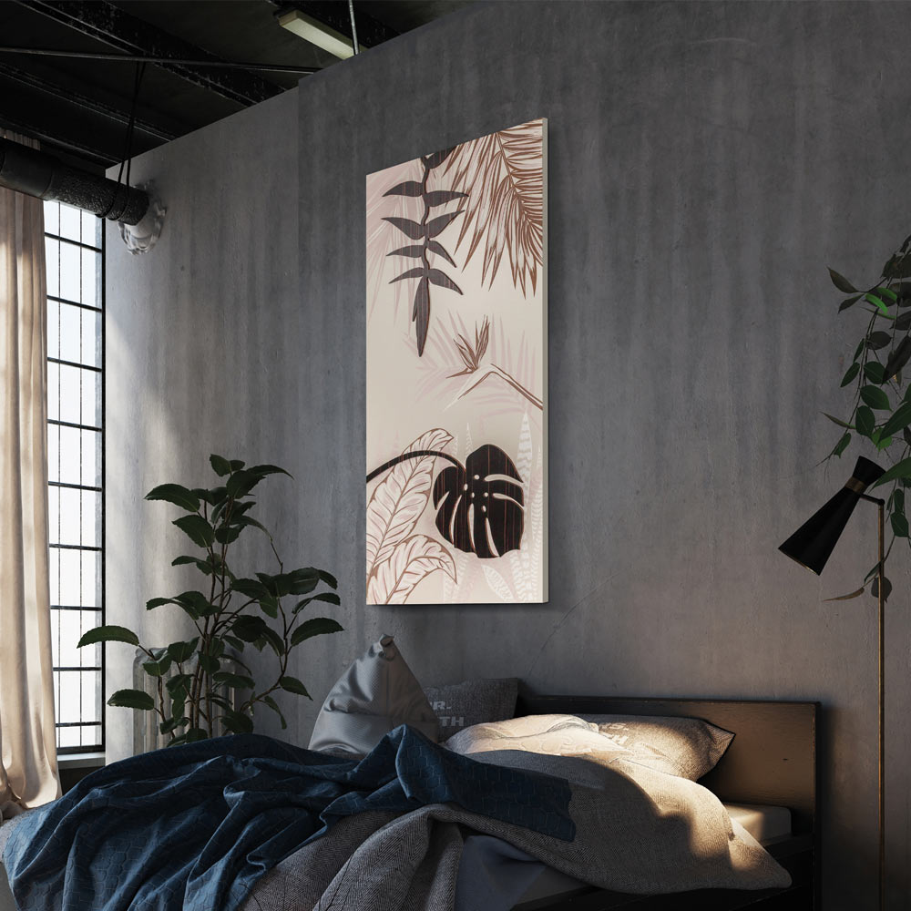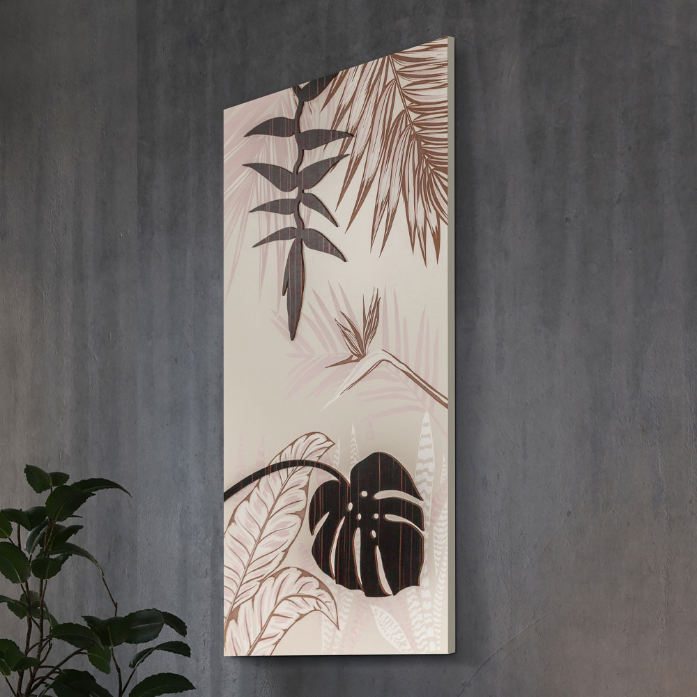 Panel dekoracyjny wykonany jest techniką znakowania laserowego , która tworzy na materiale płaskorzeźbę , tworząc różne tonacje kolorystyczne liści tworzonych na panelu. Obraz wykonany jest z drewna lakierowanego piaskiem matowym z aplikacjami z drewna hebanowego . Pozostałe kolory na panelu takie jak różowy, brązowy nadawane są poprzez znakowanie laserowe.