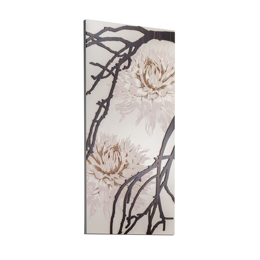Panel dekoracyjny wykonany jest techniką znakowania laserowego , która tworzy płaskorzeźbę na materiale, tworząc różne tonacje kolorystyczne kwiatu, a dokładnie dalii. Obraz wykonany jest z drewna lakierowanego piaskiem matowym z aplikacjami z drewna hebanowego . Różowy kolor dalii nadawany jest techniką znakowania laserowego.