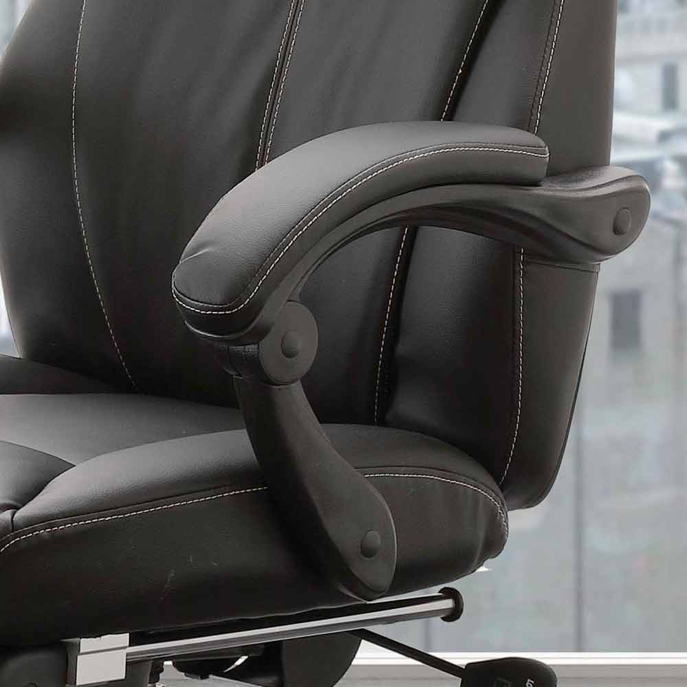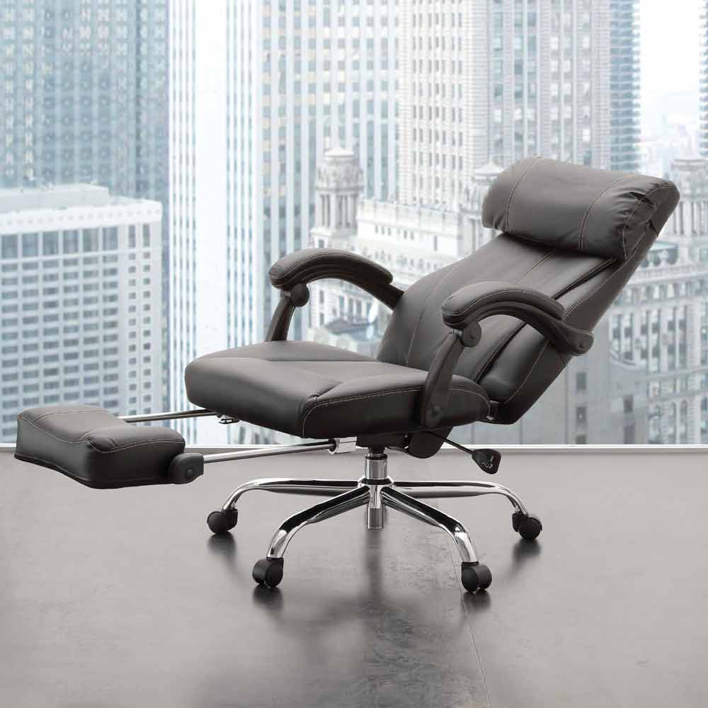 Fotel biurowy Nazzareno najlepiej oddaje wszystkie te cechy; jest wyposażony w obrotowe siedzisko z podnośnikiem gazowym, oparcie z poduszką obitą czarną ekoskórą, siedziska i podnóżek w czarnej ekoskórze; chromowany metalowy stelaż z kołami.