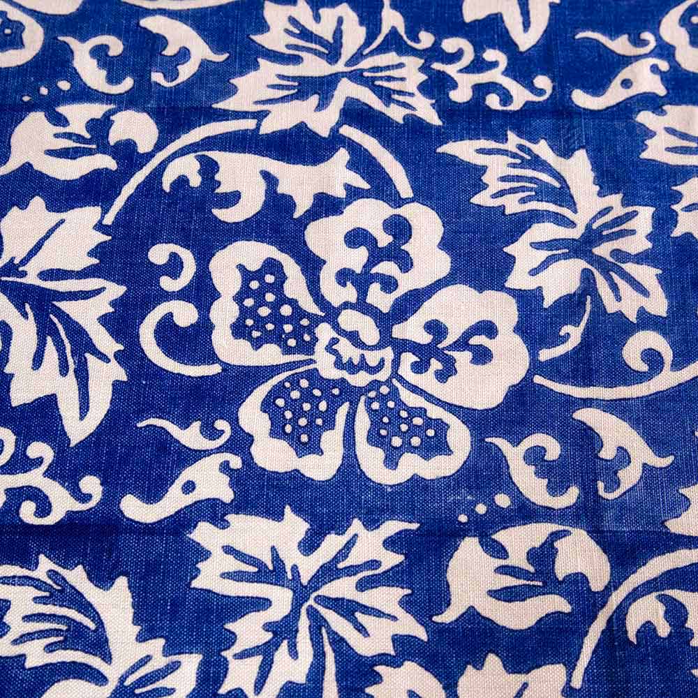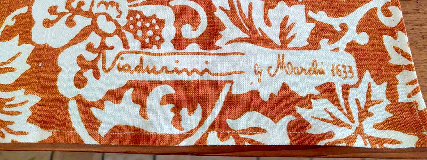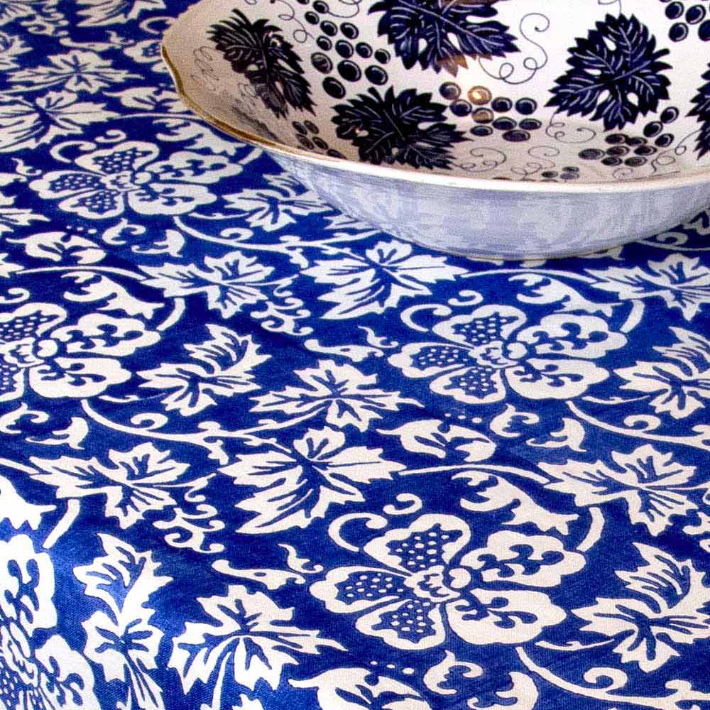 Wysokiej jakości włoski obrus z czystego lnu, w całości ręcznie drukowany w kolorze niebieskim lub rdzawym z drewnianymi formami z artystycznym wzorem różanego okna, wyjątkowy i wysokiej jakości kawałek wykonany we Włoszech.
