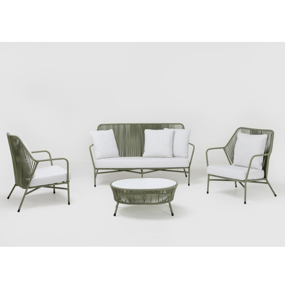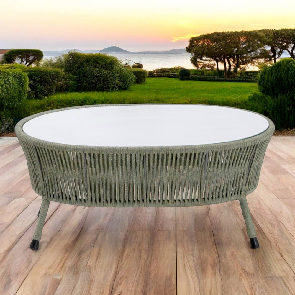 Ten stolik ogrodowy jest idealny do cieszenia się przestrzenią na zewnątrz. Jego design jest nowoczesny, z lekką strukturą z plecionej liny, która tworzy grę przezroczystości i cieni, dodając głębi i wizualnego zainteresowania Twojemu ogrodowi lub tarasowi.
