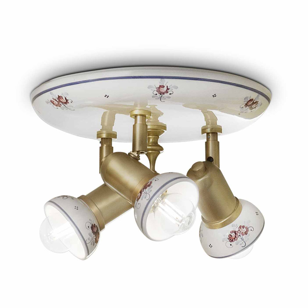 Okrągła 3-punktowa lampa sufitowa z mosiądzu i ręcznie malowanej ceramiki, wyprodukowana we Włoszech przez Ferroluce.