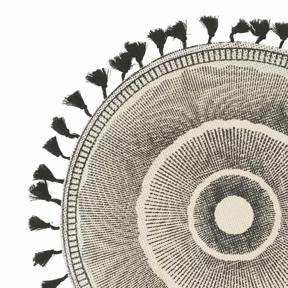 Okrągła podkładka z białej juty ozdobiona czarnymi frędzlami, 12 sztuk.