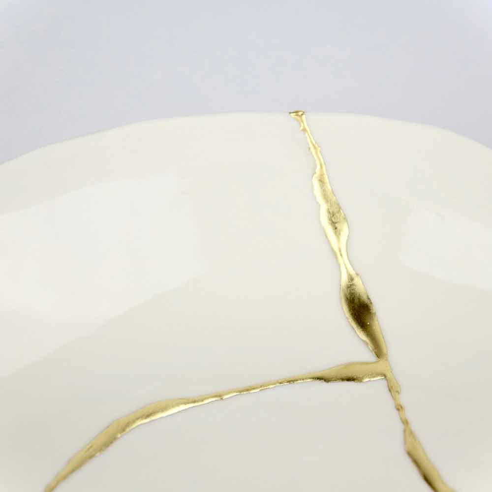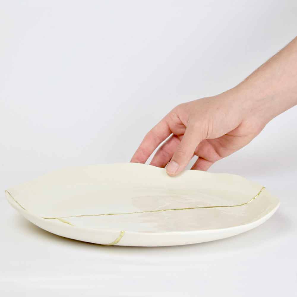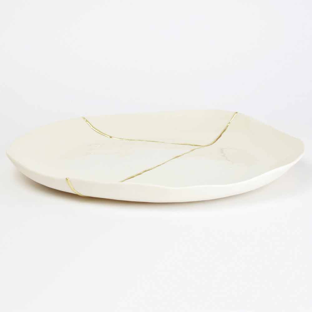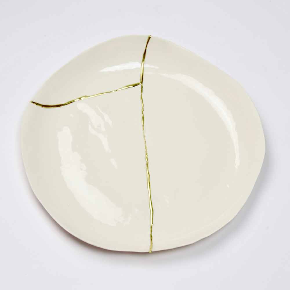 Wykonana z najlepszej białej porcelany , ta okrągła taca na monety nawiązuje do japońskiej filozofii kintsugi, która polega na wzmacnianiu, a nie ukrywaniu, ran życia, ponieważ są one częścią naszej historii i przyczyniają się do uczynienia nas ludźmi, którymi jesteśmy dzisiaj. W ten sposób każdy przedmiot uszkodzony podczas gotowania w piekarniku jest naprawiany przy użyciu 22-karatowego złota płatkowego jako kleju, który tworzy cudowną cenną bliznę.