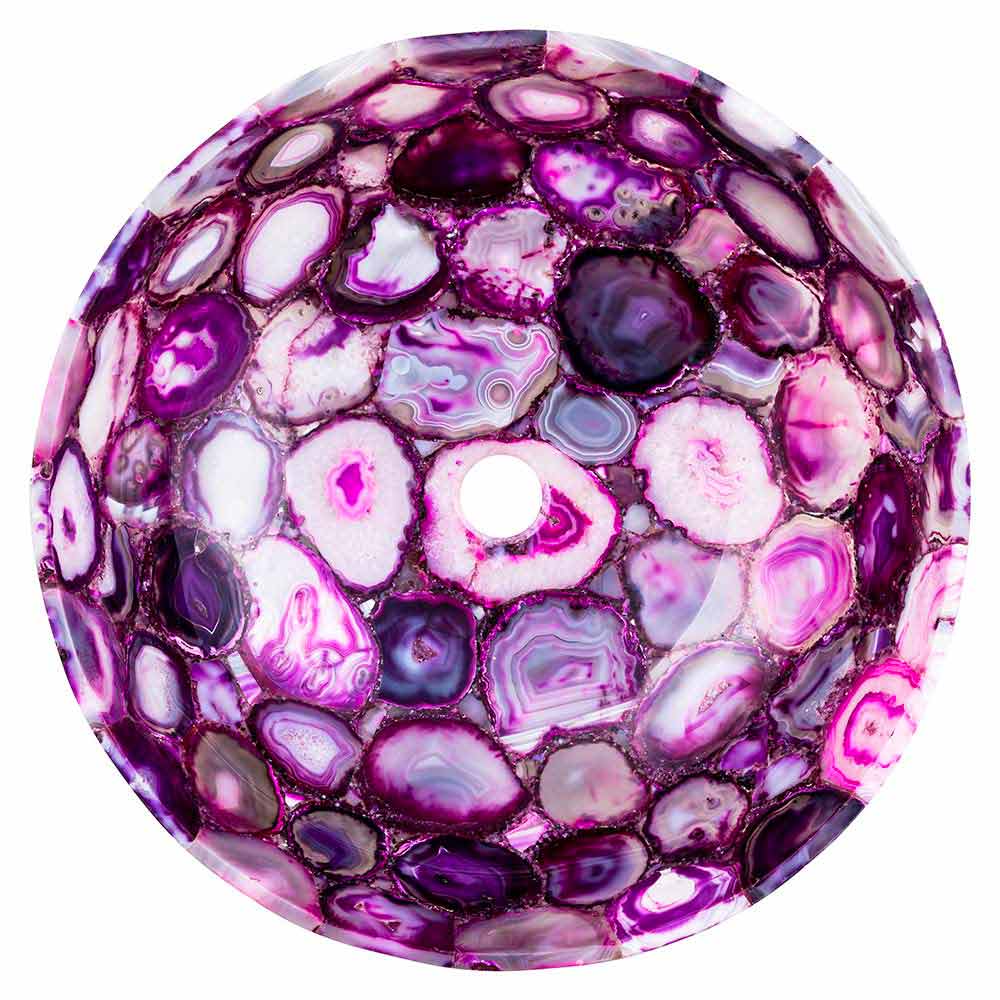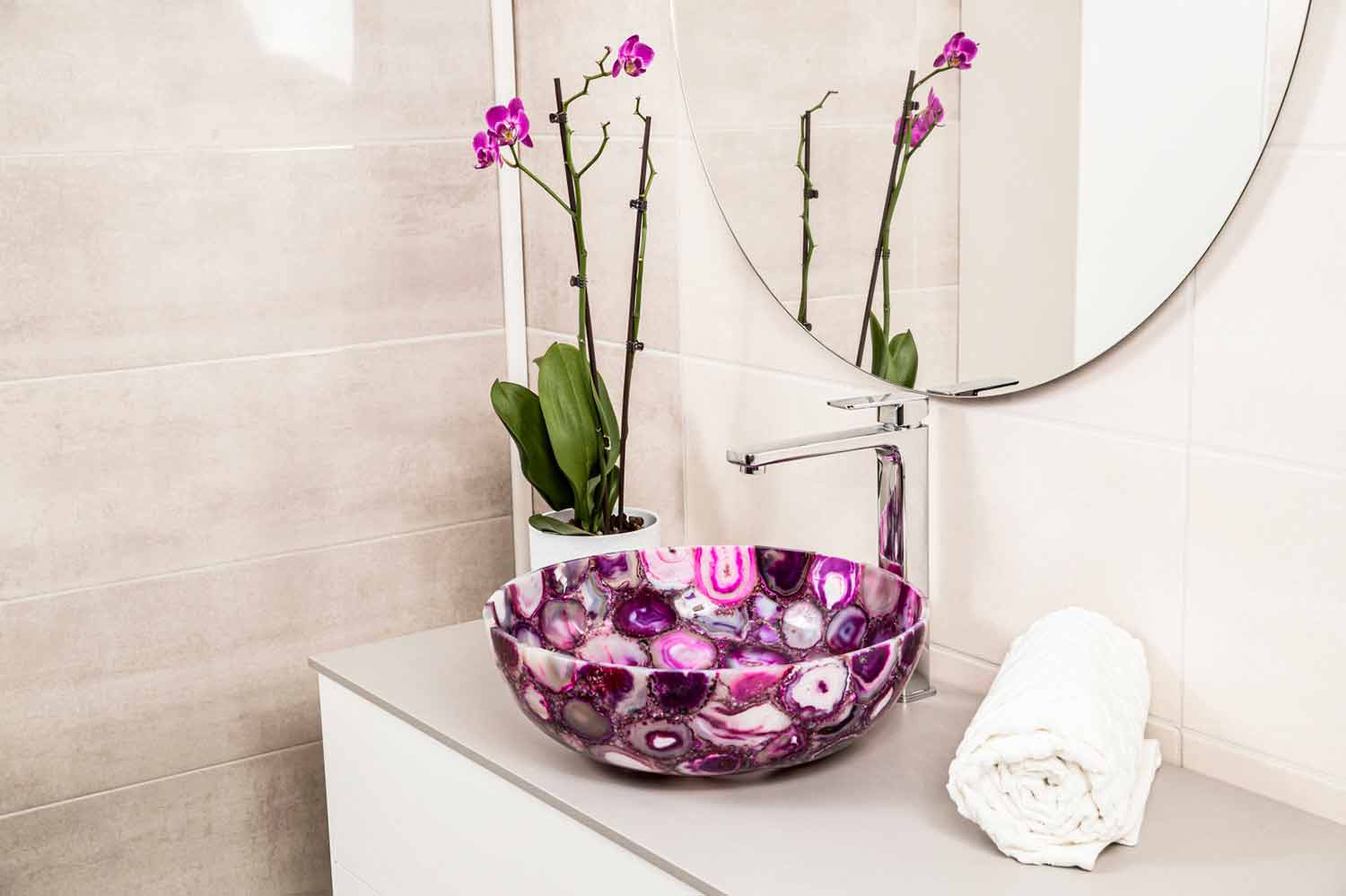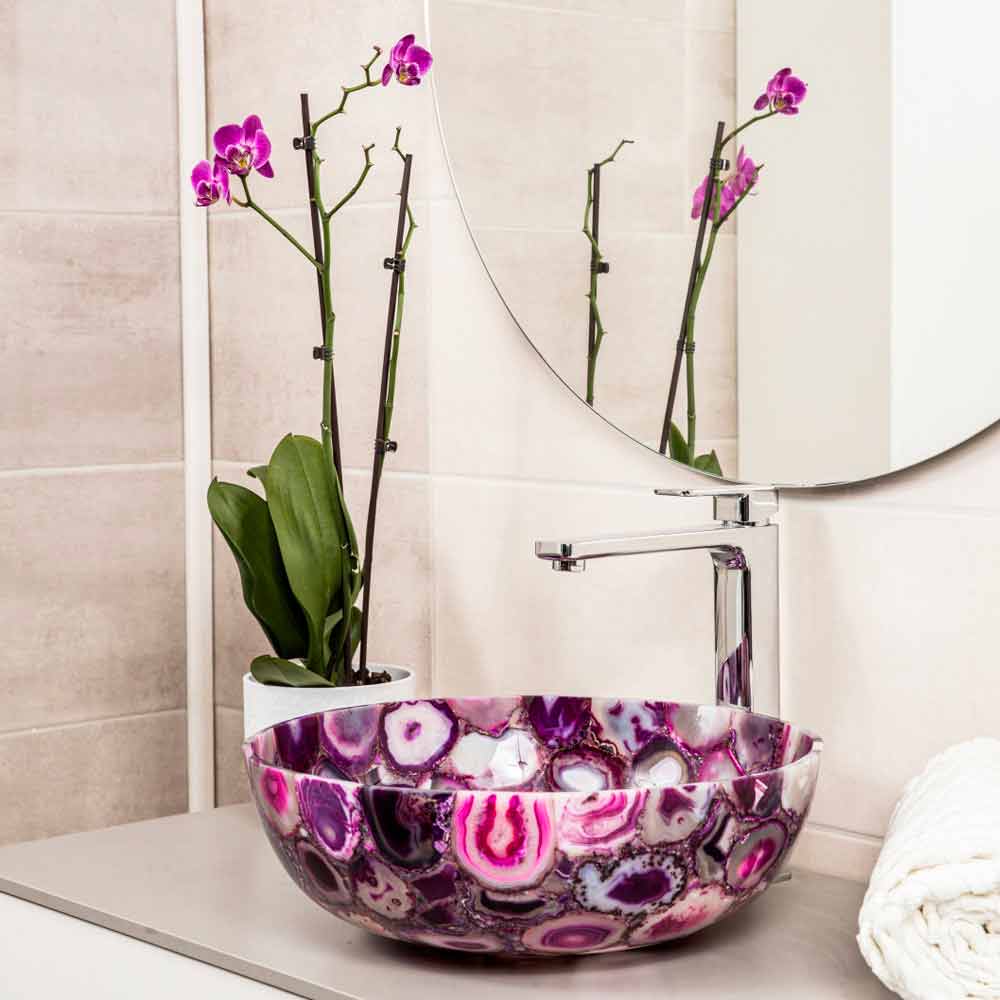 Buffalo to kolorowa okrągła umywalka nablatowa wykonana z półszlachetnego kamienia agatowego . Wykończenie jest prześwitujące.