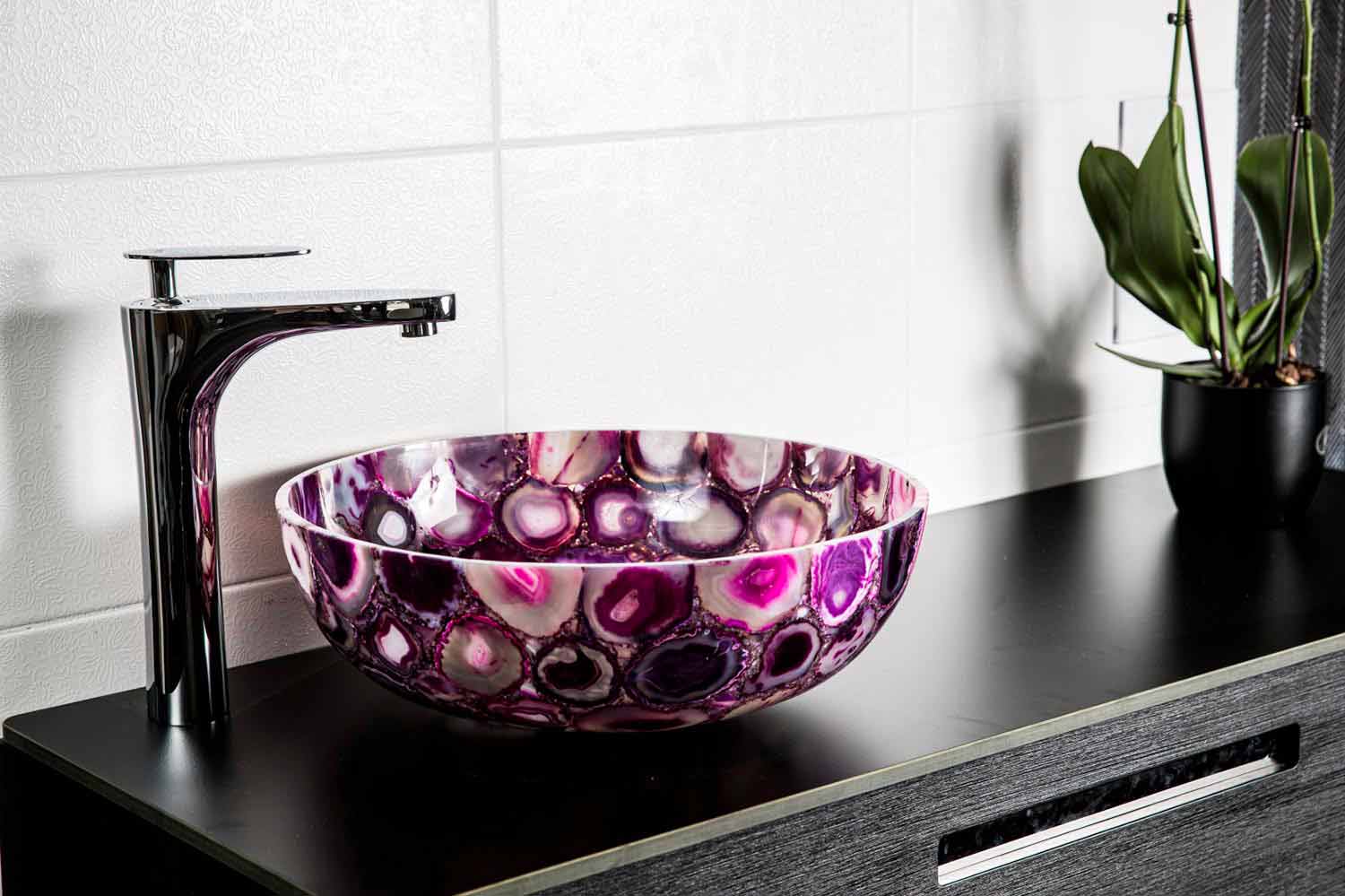 Umywalka nablatowa wykonana ręcznie z kamienia agatowego.