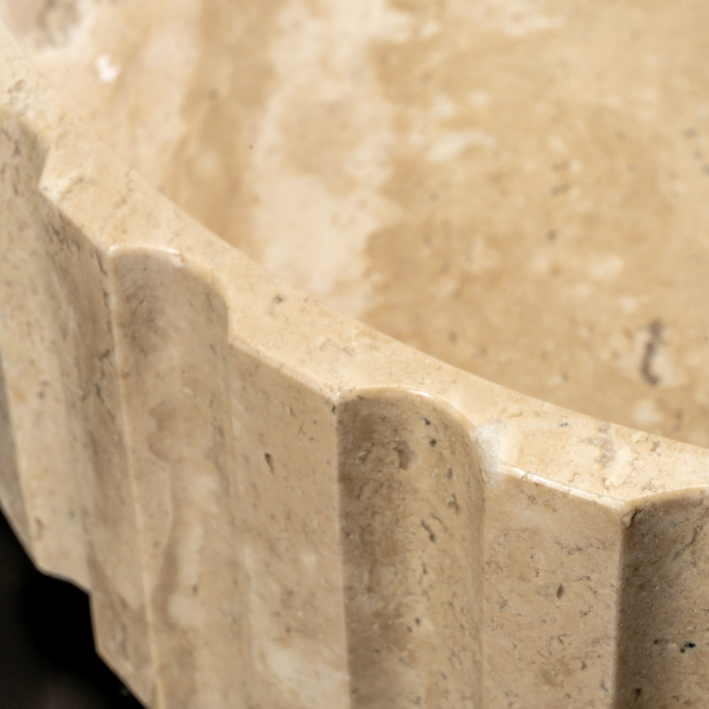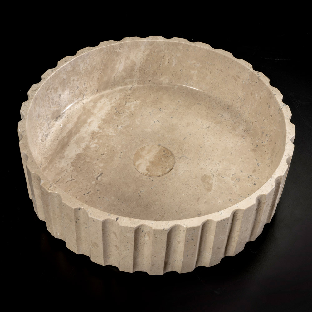 Umywalka nablatowa z trawertynu łączy w sobie kunszt wykonania i wyrafinowaną, luksusową estetykę. Każdy egzemplarz, wyrzeźbiony z jednego bloku trawertynowego marmuru, jest wyjątkowy dzięki charakterystycznym żyłkom i różnicom kolorystycznym, które czynią go ekskluzywnym. Wykonany z tego samego marmuru korek klik-klak nie tylko dopełnia całości, ale także zapewnia nienaganną funkcjonalność. Umywalka ta to elegancki wybór dla osób poszukujących wartościowego mebla, dzięki któremu łazienka stanie się luksusową przestrzenią.