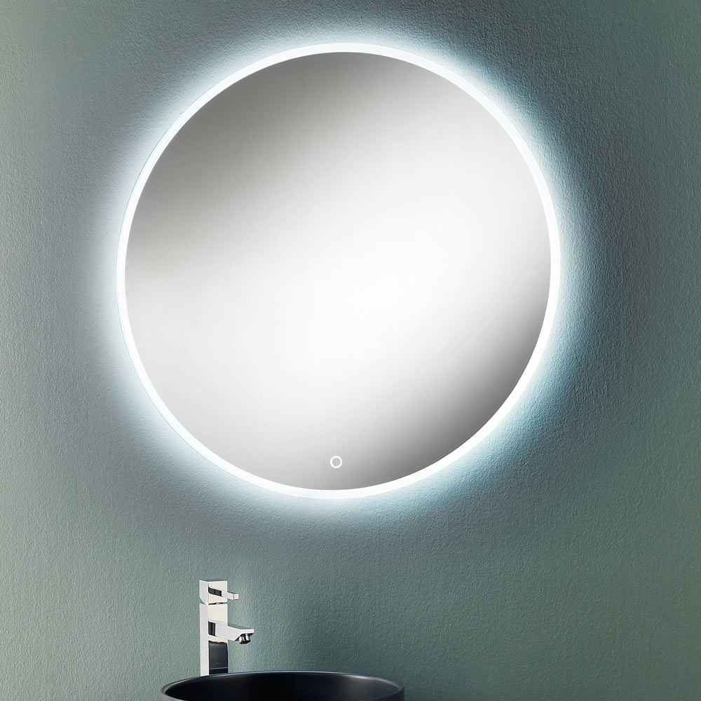 Okrągłe lustro łazienkowe o nowoczesnym designie z piaskowaną i podświetlaną krawędzią, wyprodukowane we Włoszech.