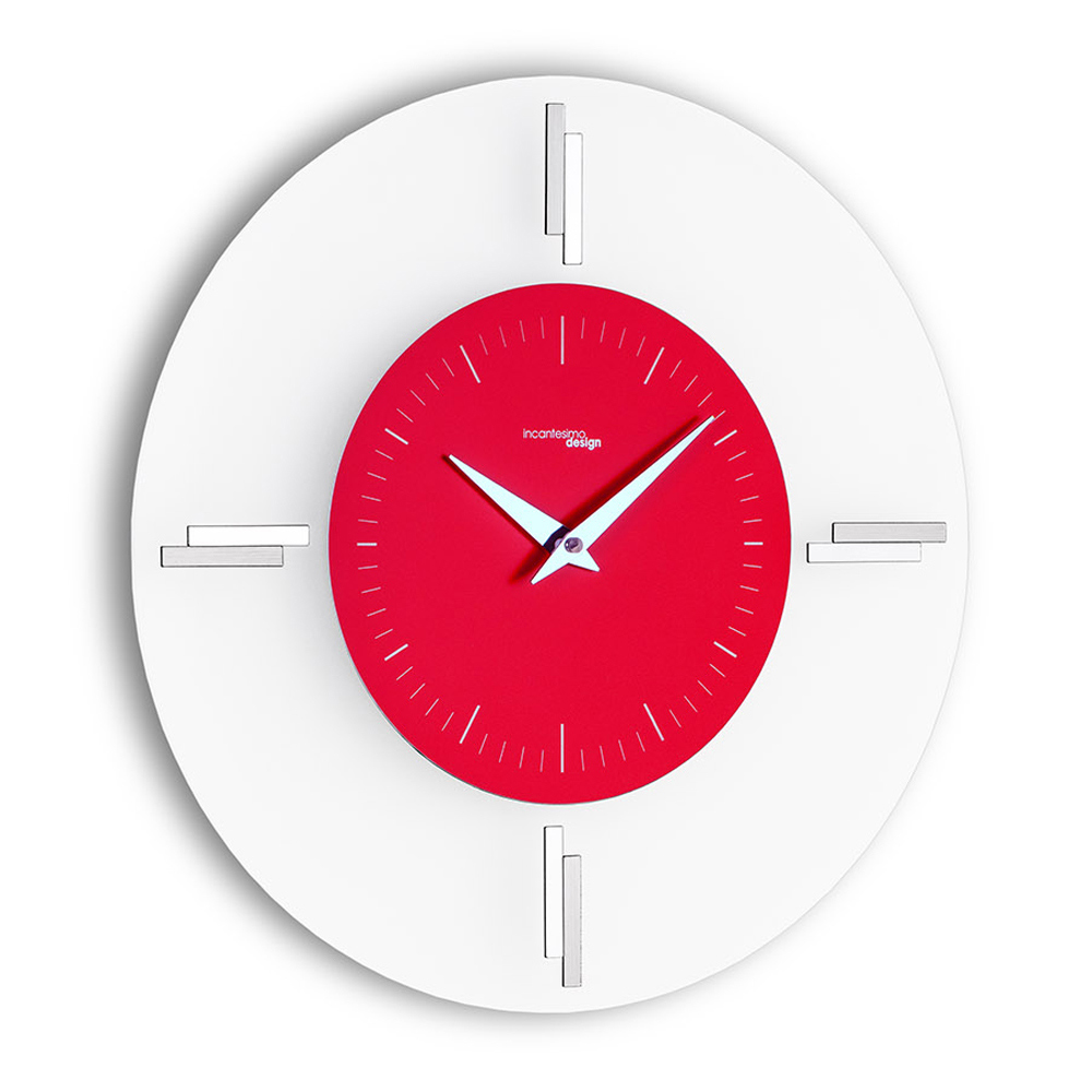 Okrągły zegar ścienny z metakrylanu i aluminium, wyprodukowany we Włoszech.