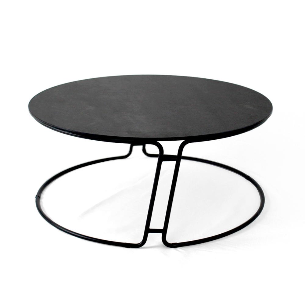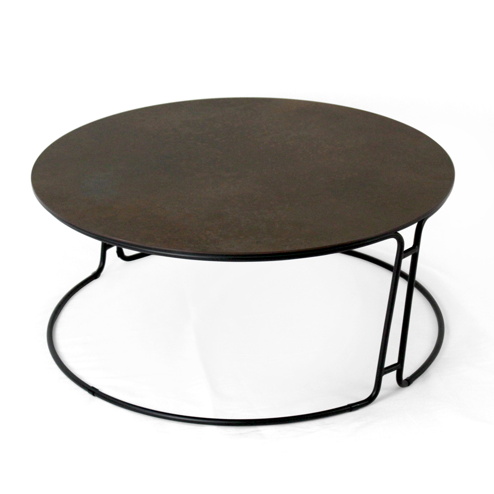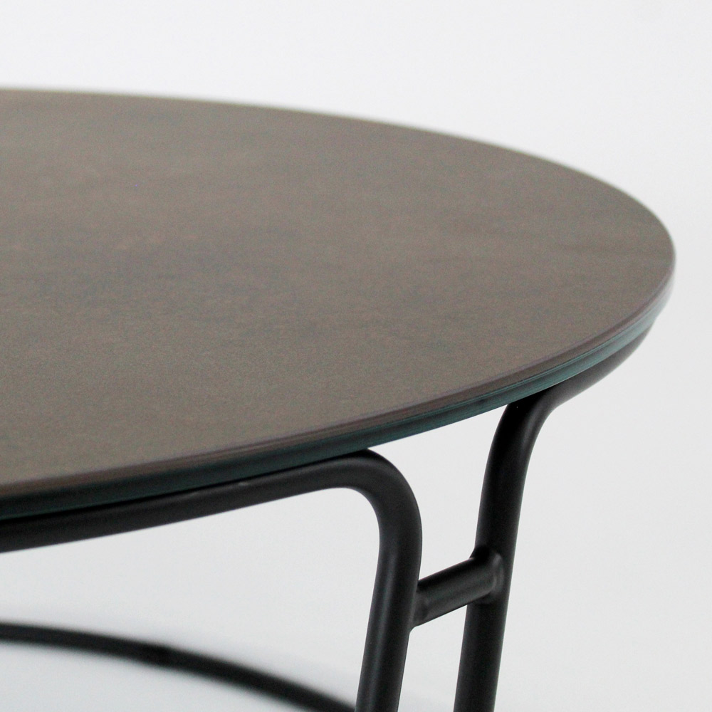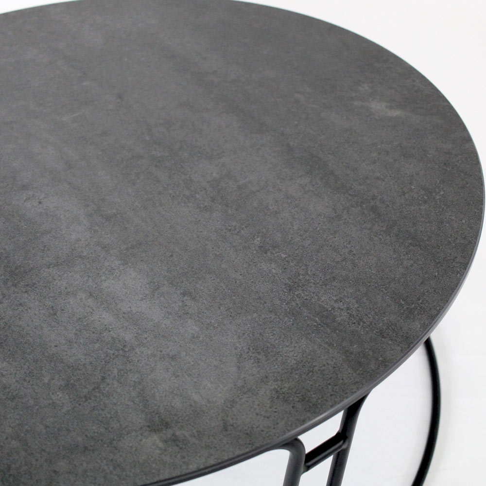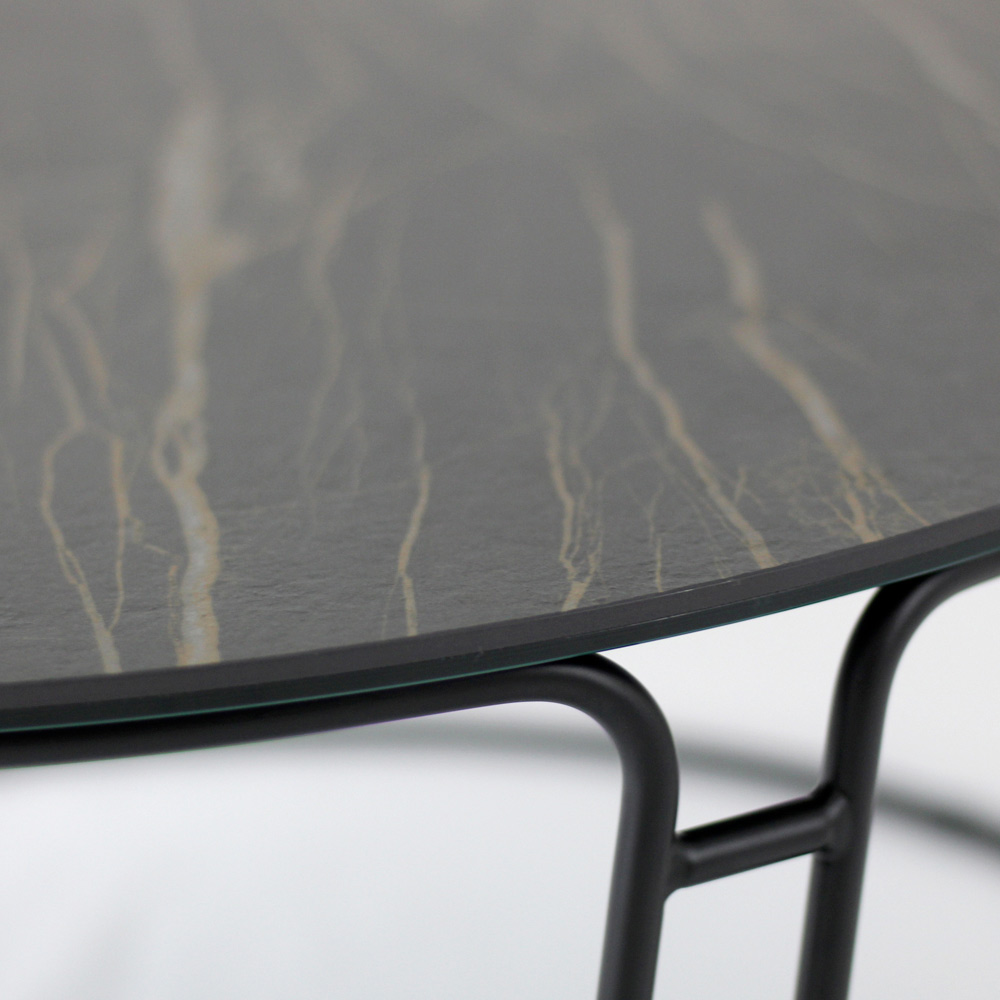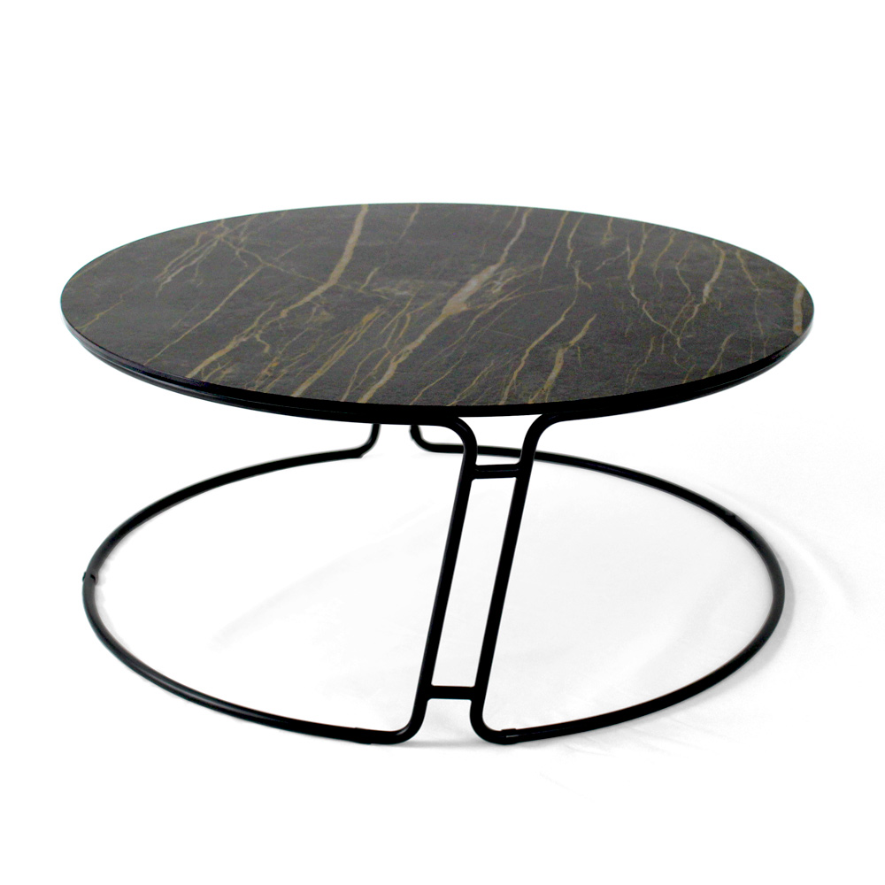 Okrągły stolik kawowy z malowaną stalową podstawą i blat z kamionki porcelanowej.