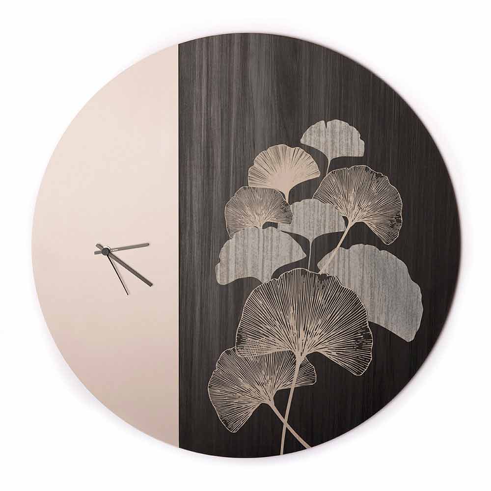 Drewniany zegar ścienny z dekoracją znakowaną laserowo, okrągły wzór w dwóch wykończeniach wyprodukowany we Włoszech.