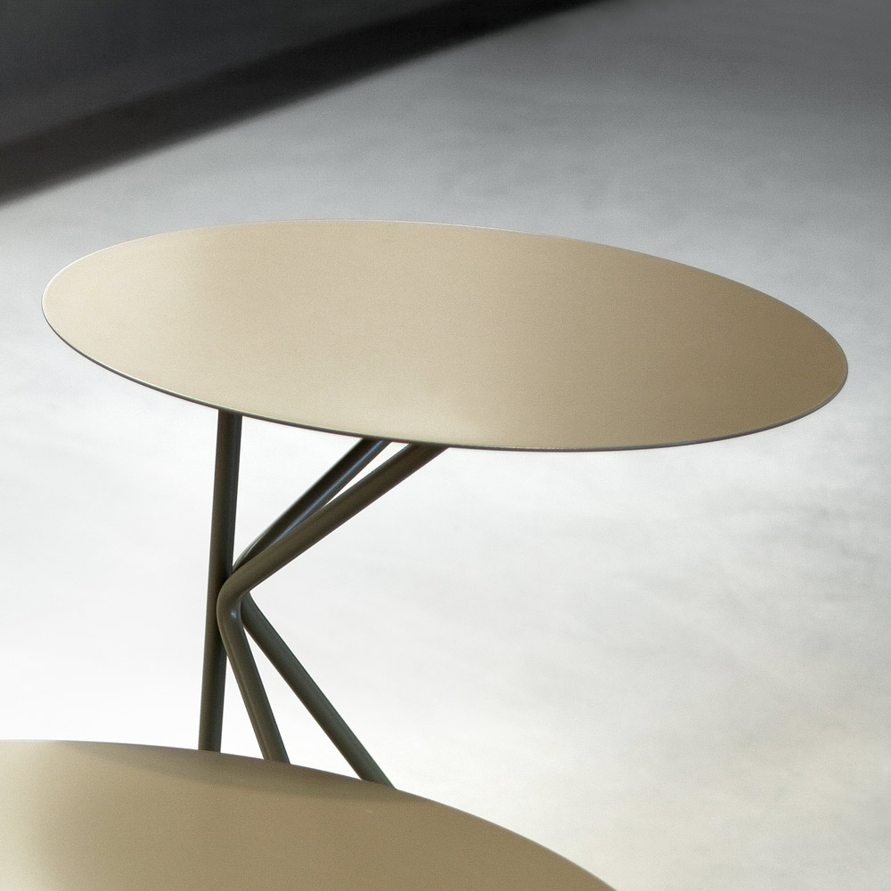 Ten stół ogrodowy ma minimalistyczny design z okrągłym blatem , dostępny w dwóch różnych rozmiarach, które można łączyć ze sobą, aby uzyskać nowoczesny i elegancki salon.