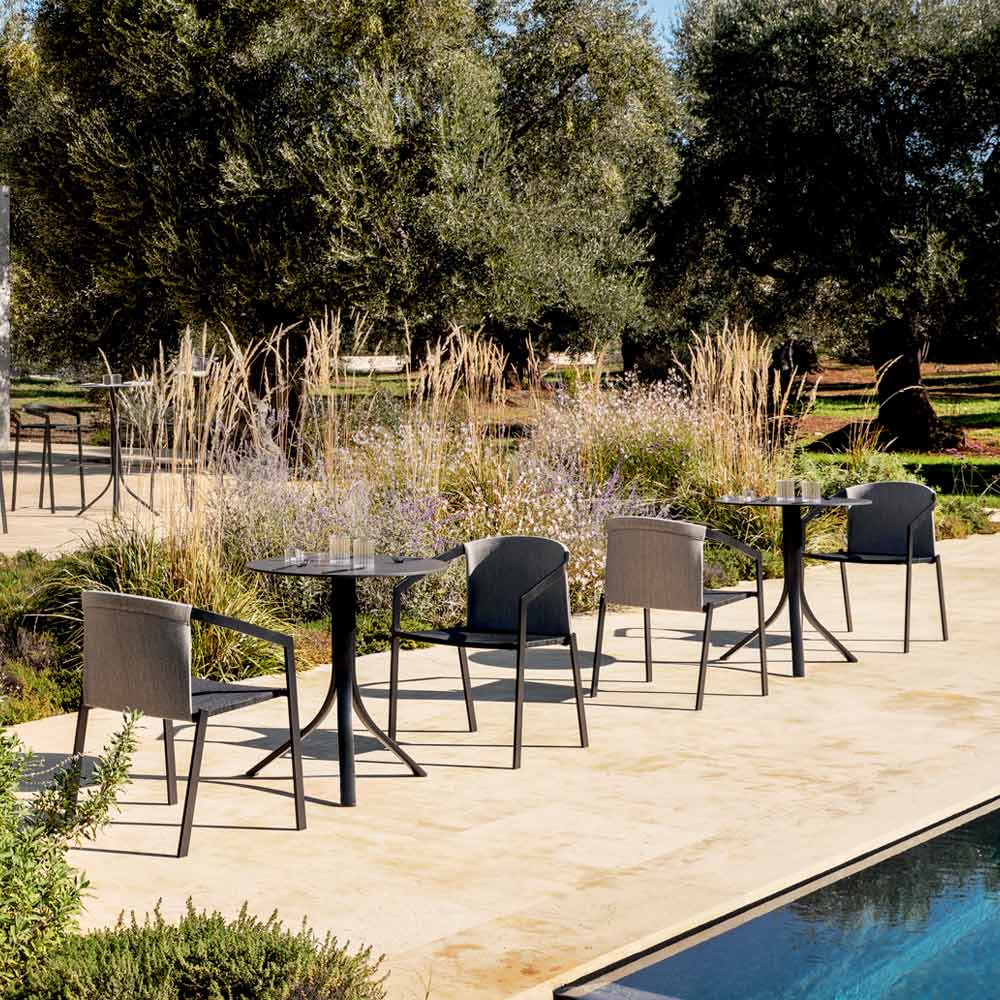 Kolekcję charakteryzuje szczegół aluminiowej nogi jako centralny punkt w połączeniu z formalnym rygorem, aby doświadczyć przebywania na świeżym powietrzu w zakresie maksymalnego relaksu i biesiady, siedząc na sofie, wokół stołu lub leżąc na leżaku.
