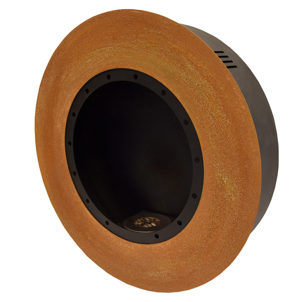Biokominek ścienny o nowoczesnym i okrągłym kształcie ze stali, wyprodukowany we Włoszech.