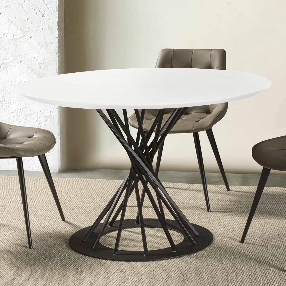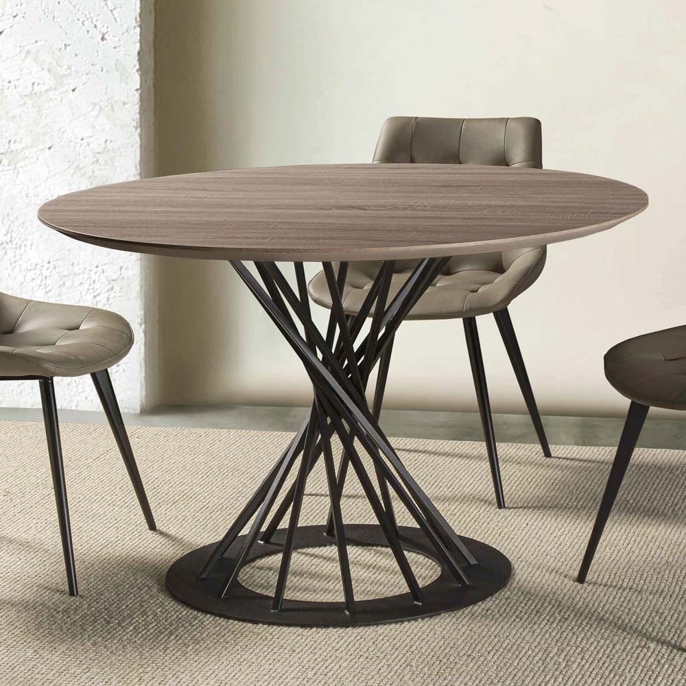 Okrągły stół do jadalni z blatem z laminowanego drewna i stalową podstawą o średnicy 120 cm.