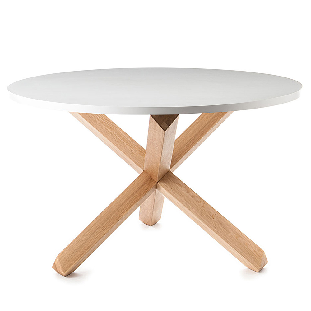Okrągły stół do jadalni wykonany z płyty mdf i litego drewna.