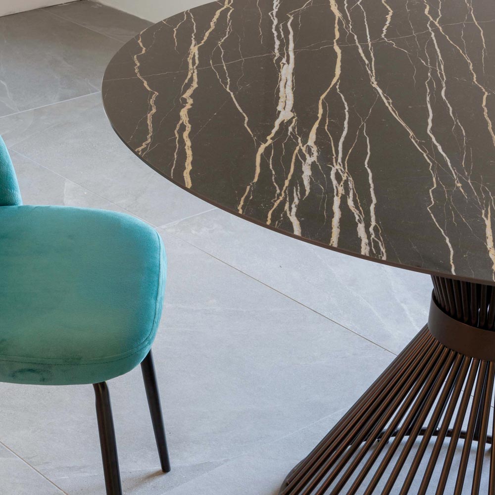 Okrągły stół do salonu wykonany z ceramiki i stali