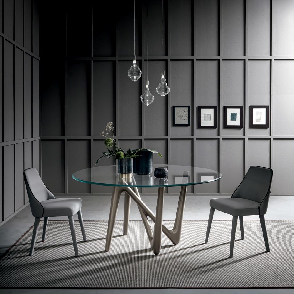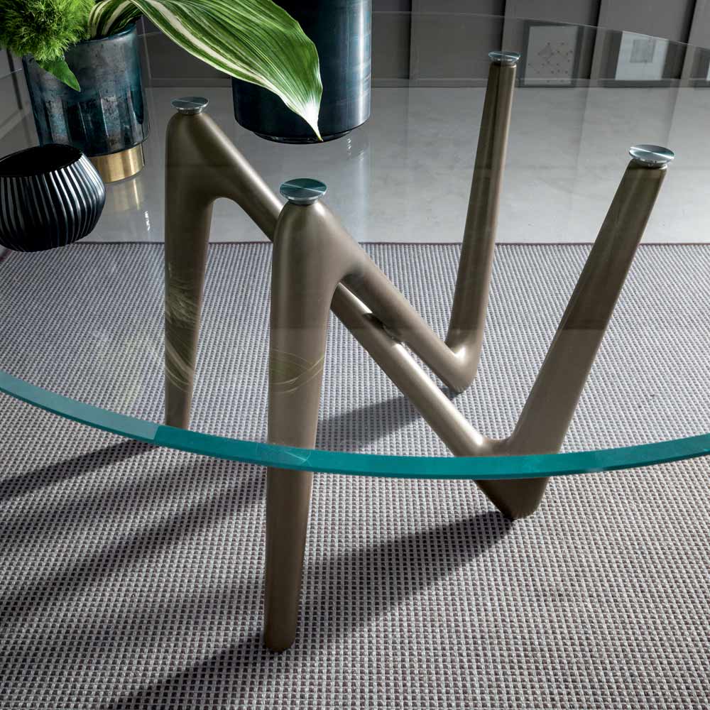 Ten okrągły stół jadalny ma konstrukcję z nogami z twardego poliuretanu pomalowanego na metaliczny brąz i beczkowym blatem z bardzo przezroczystego, hartowanego szkła ze ściętą krawędzią.