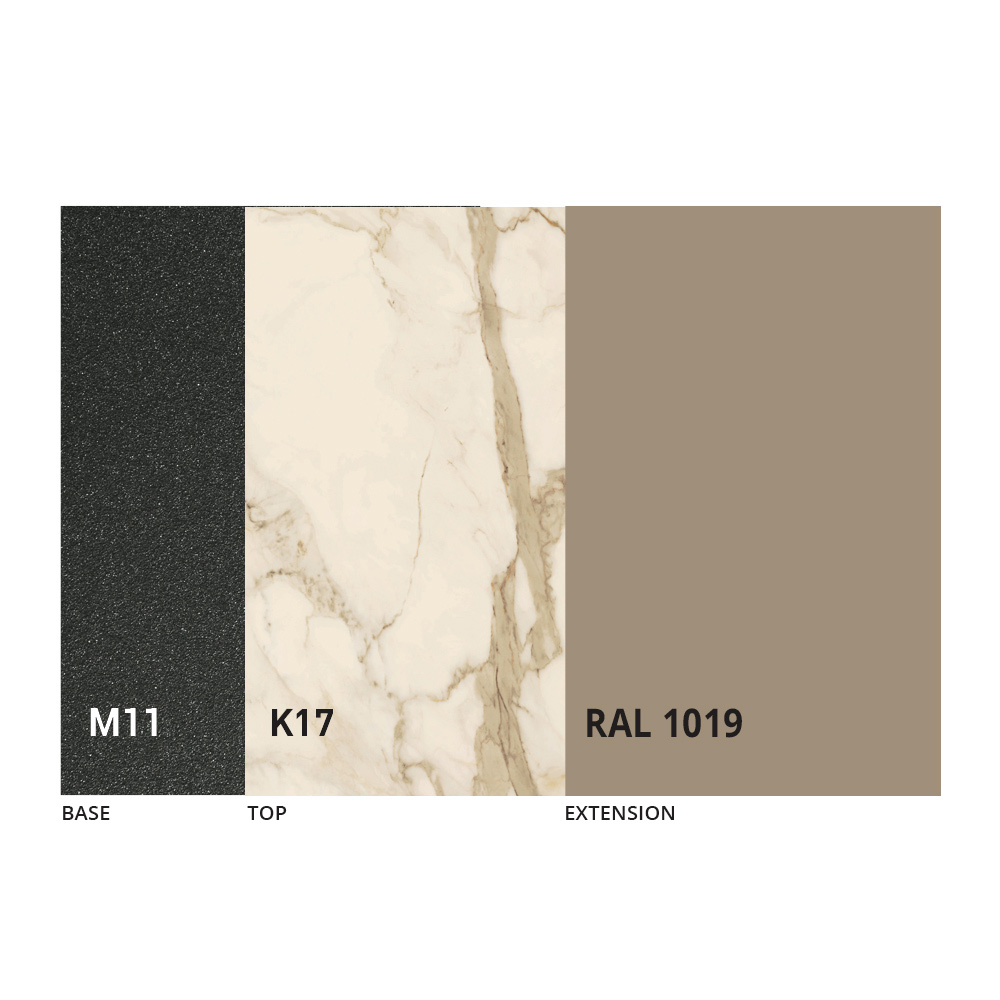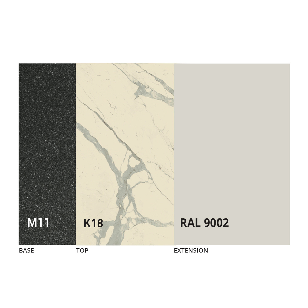 ceramicznym blatem, który jest podzielony na dwie półpłaszczyzny, aby pomieścić centralne przedłużenie wewnętrzne z otworem na książki, zwiększając w ten sposób powierzchnię i możliwości towarzyskie.