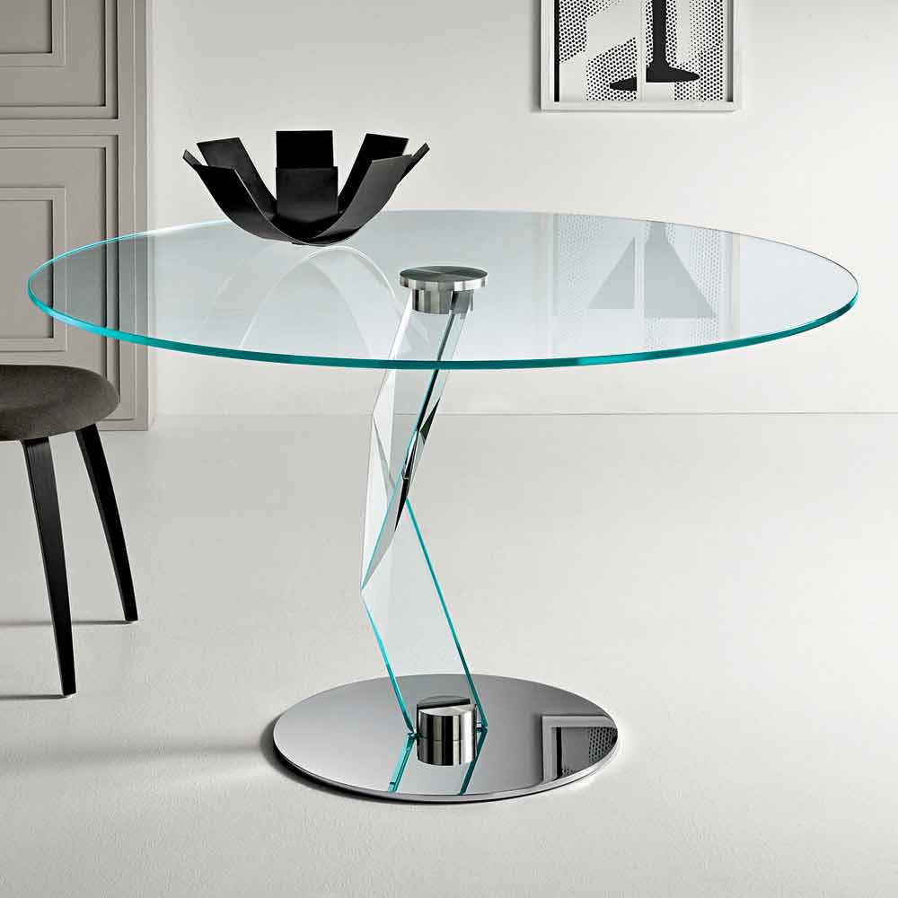 Okrągły stół kuchenny z wyjątkowo przezroczystym szklanym blatem i wyjątkowo przezroczystym szkłem oraz chromowaną metalową podstawą o nowoczesnym designie, wyprodukowany we Włoszech.