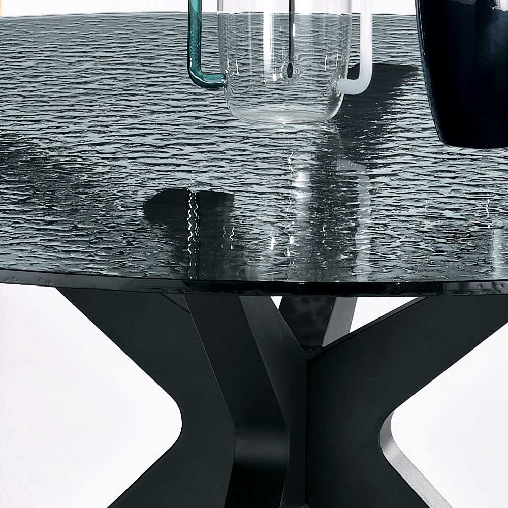 Elegancki, okrągły stół jadalny o nowoczesnym designie, idealny do dodania stylowego akcentu do jadalni lub salonu . Blat wykonany jest z przydymionego, młotkowanego szkła , o eleganckim wykończeniu, które tworzy unikalny, teksturowany efekt i dodaje przestrzeni wizualnej głębi.