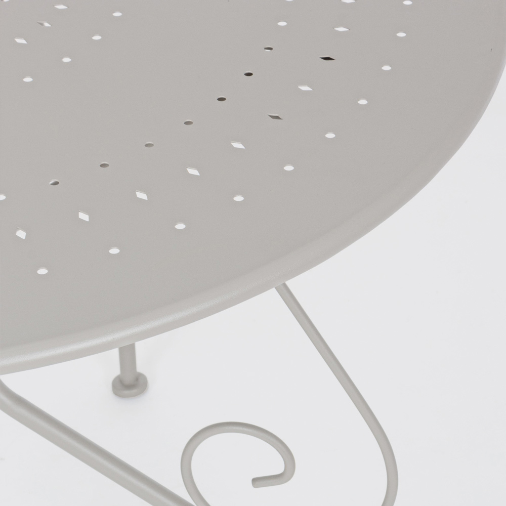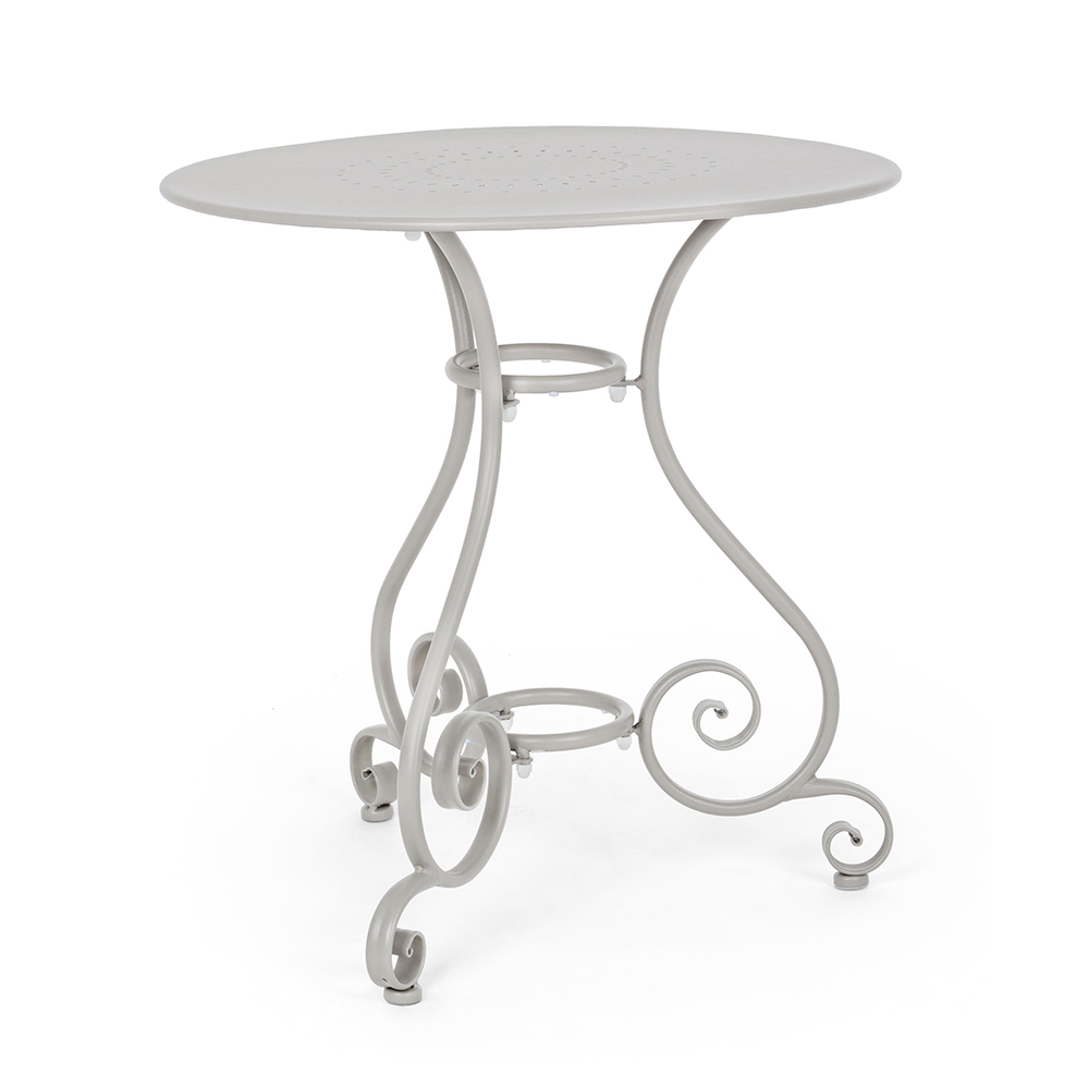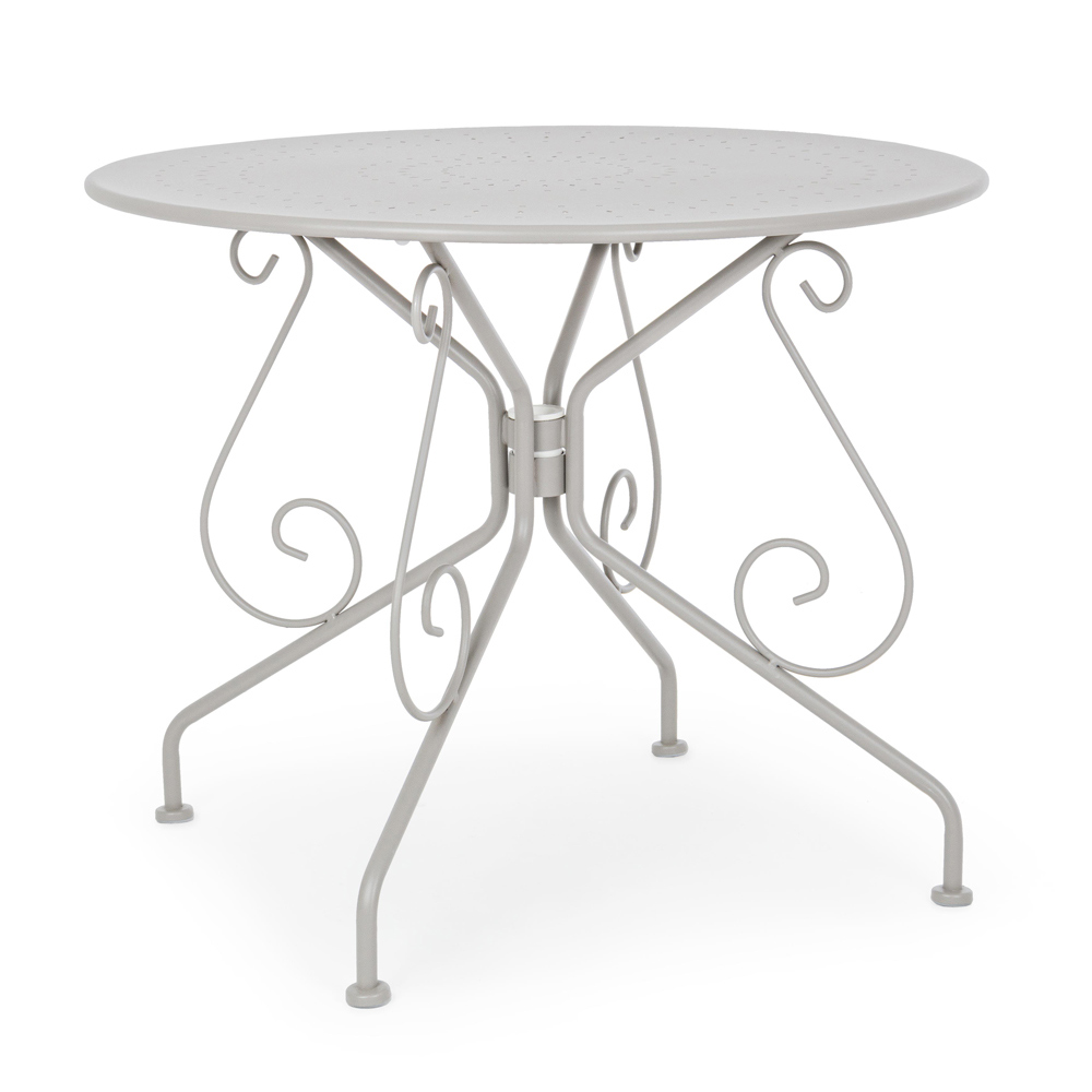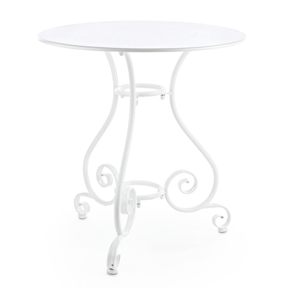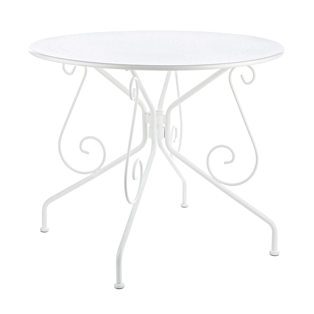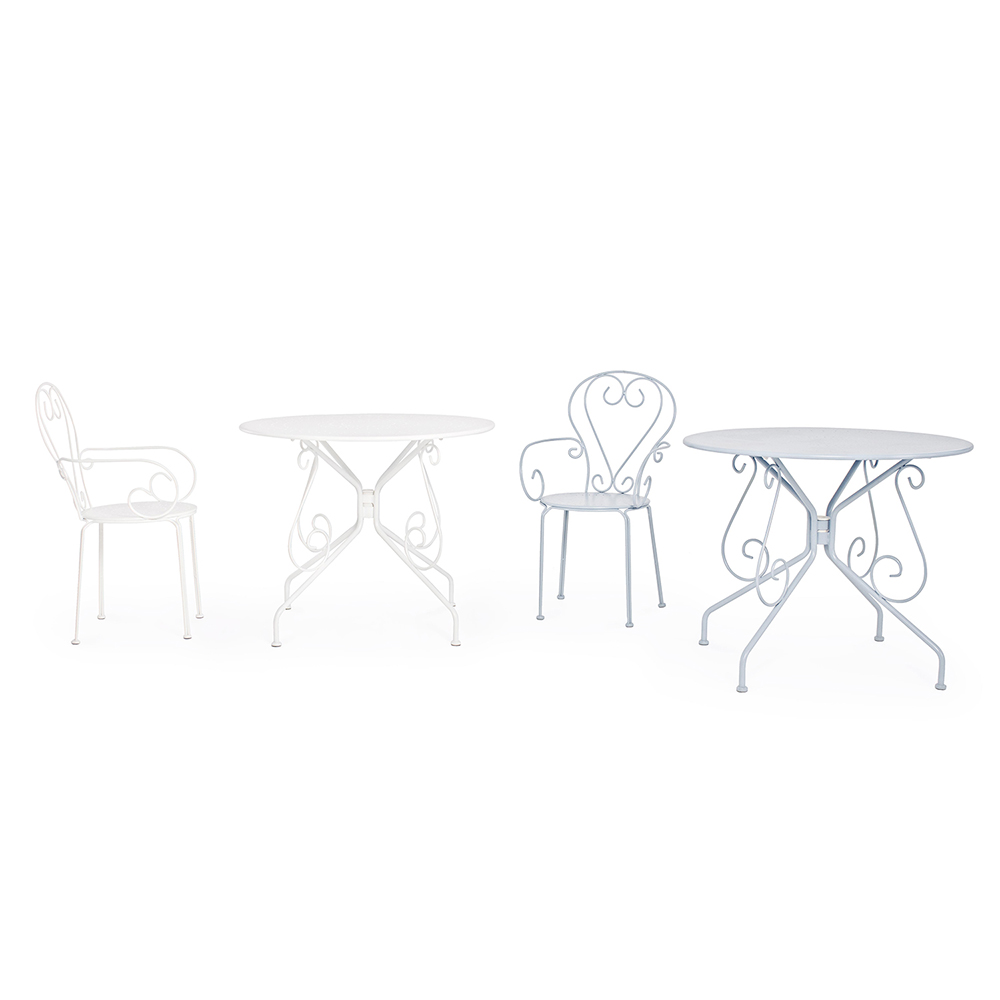 Okrągły stół na zewnątrz w stylu Shabby Chich wykonany z malowanej stali i dostępny w dwóch różnych rozmiarach.
