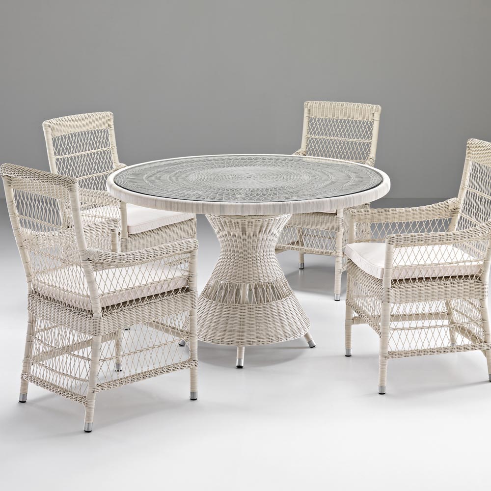 szklanym blatem, 4 foteli z podłokietnikami z aluminiową ramą i splotem Polyrattan marki REHAU. Ta kompozycja charakteryzuje się mocnym